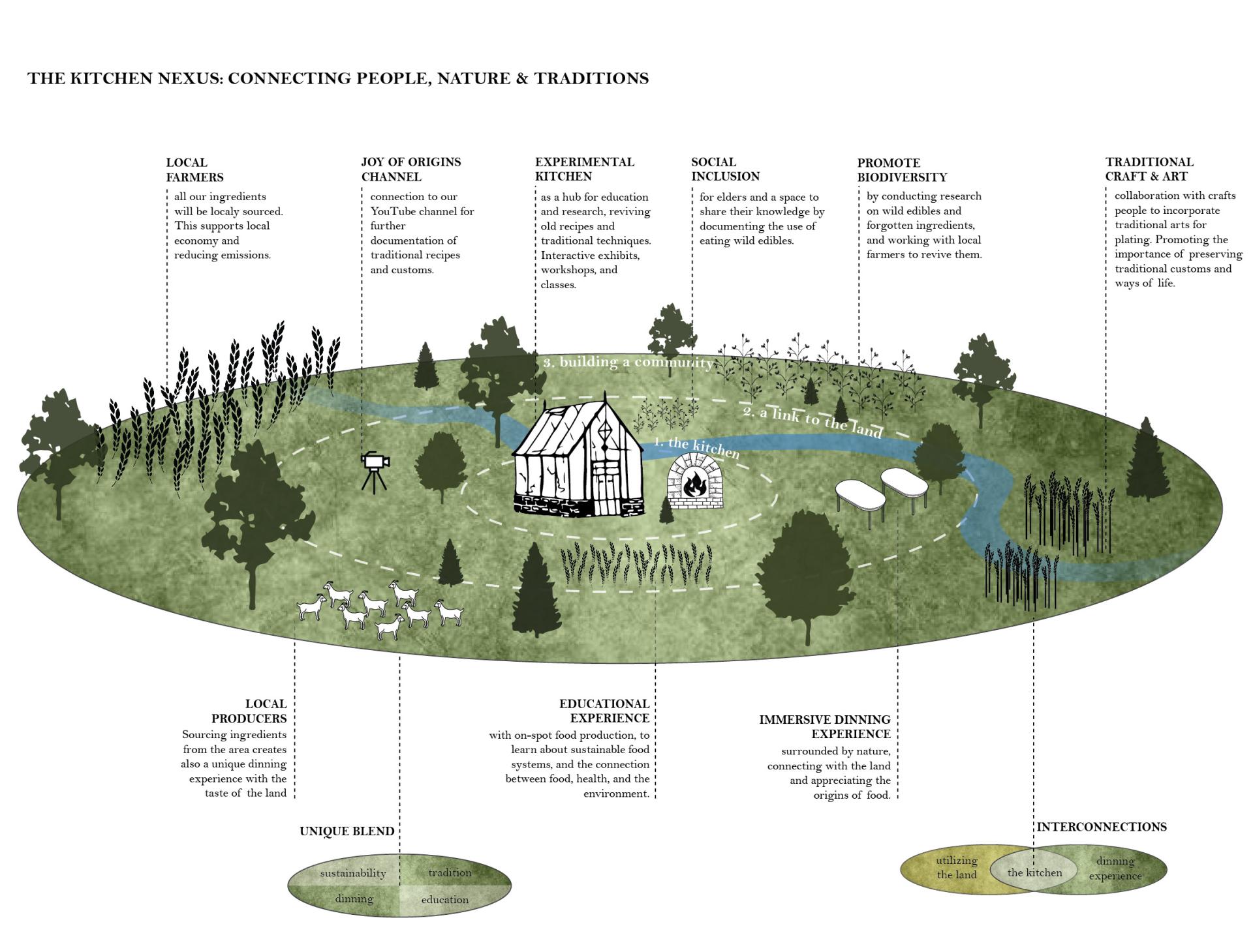Firstly, the kitchen will serve as a hub for research of old recipes and forgotten ingredients, helping to revive traditional techniques or wild edibles that have been discontinued or will be lost. It will also include some on spot agriculture productions for educational or research purposes. Additionally, the kitchen will source ingredients from local farmers and producers, supporting in this way the local economy and reducing emissions. We also plan to collaborate with local crafts people to incorporate traditional arts and natural materials into the dining experience for plating.