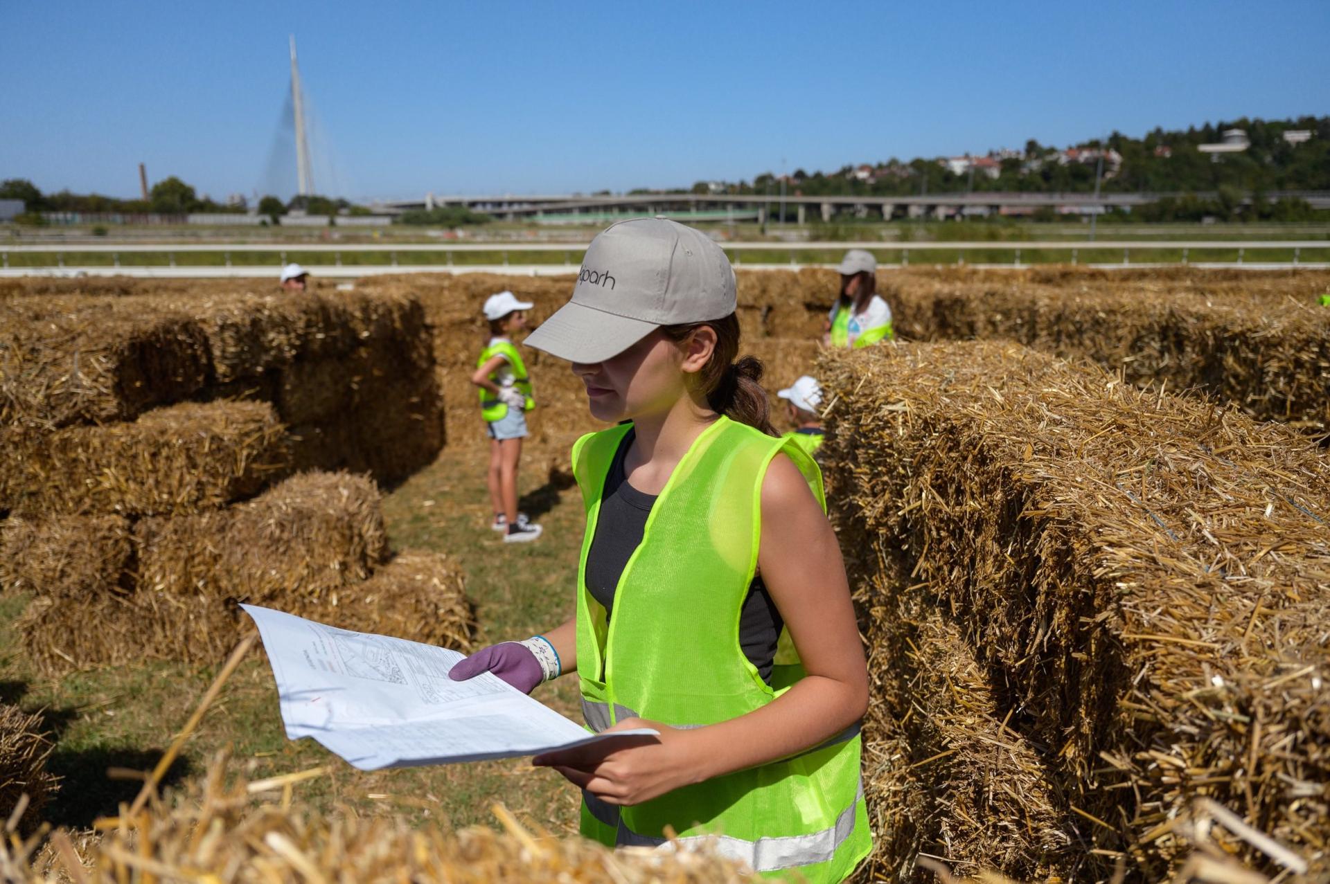 This was achieved through themes of sustainability, which was one of the central topics of the Kiparh summer. Initial information and familiarization with the concept of sustainability were provided to students at the first workshop titled Urbansprouts. With each subsequent workshop, the level of knowledge grew, and the sphere of information expanded, culminating in the abstract idea of sustainability being put into practice through the construction of the Hay Maze pavilion – a project of ten-year-old Manja Pavlović.