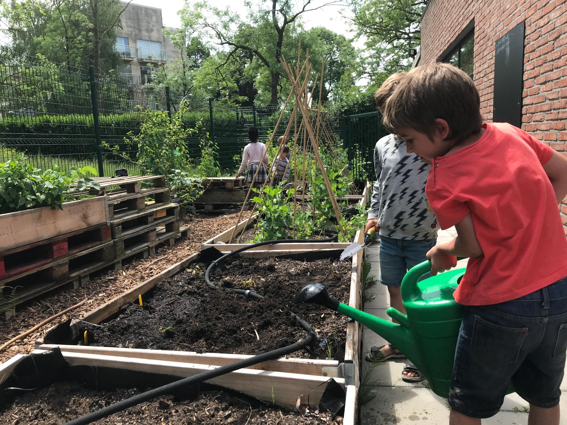 In addition, air quality in and around our school is also important. Here too, more trees play an important role. They help to capture our CO2 emissions, retain it and thus help to filter the air. The series of lessons and projects brought this story into the classroom. Water is essential to our story. The softening of our playground ensures that rainwater is collected, recovered and infiltrated. During storms we avoid the sewage system in the city to flood and we re-use our captured water. We help raising groundwater levels by helping the water to infiltrate in the soil. To teach our children the importance of biodiversity and a healthy ecosystem, they help take care of our playground. Through outdoor lessons and contact with greenery, they are given co-responsibility for their playground. The bee project ‘Bie Paulus’ at our school, which is run by a few parents, also brings the children straight to the essence of what a healthy ecosystem stands for.