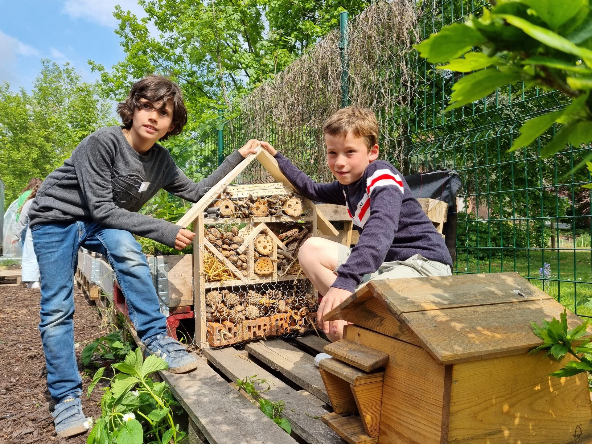Some parents have started a bee project on the school site with the help of the school. This is called “Bie Paulus”. In an old, modified sea container there are six hives. This provides a lot of honey and fun learning projects with the children! An entrance gate was also automated and equipped with remote control. Via an app we can operate it. We are experimenting with how best to organize our opening. Among other things, we drew up a set of rules and regulations. We see that our pioneering role and bold choices are inspiring in Flanders, where schools and their playgrounds are still too often closed bastions that are not used after school hours. At the same time, the playground with its abundance of nature is now part of the ecosystem and is a place where animals and biodiversity finally play their part.