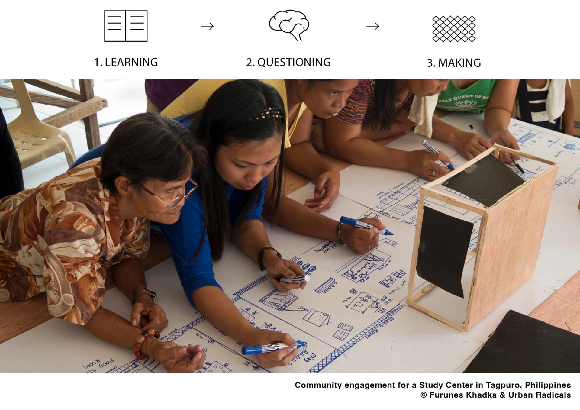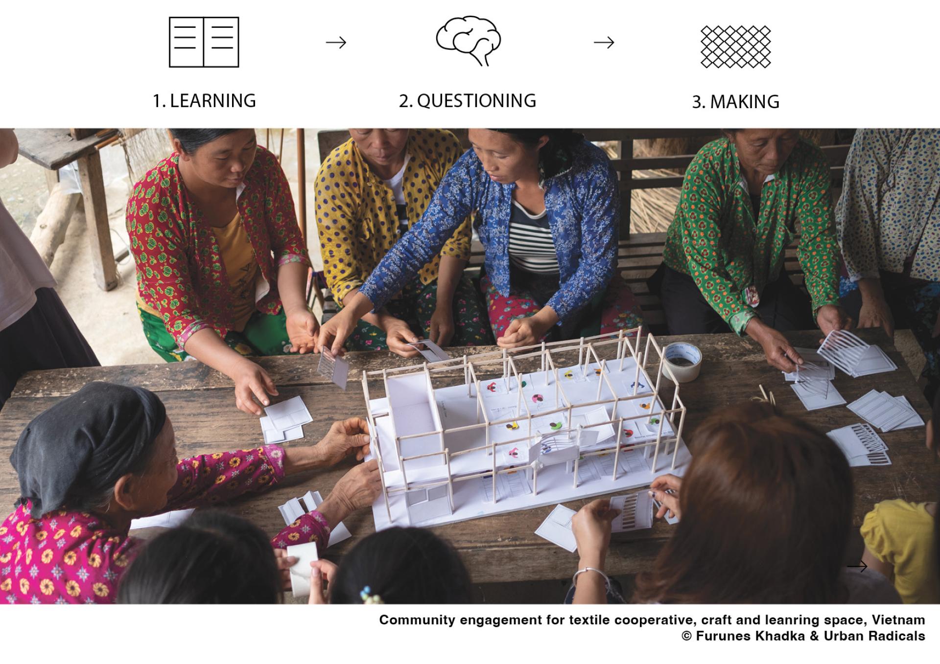Particularly relevant to highlight is the work of collaborators Eriksson Furunes and Kadha, who over the last 12 years have worked in different cultures around the world (Vietnam, China, Philippines, Brazil, Norway and India) to understand how these platforms for collaboration offer spaces for learning and for different forms of knowledge, oral and often tacit, which can only be transferred by members in a community working together over time. The examples in their attached portfolio and website show how their work in different communities has revolved around the idea of knowledge production and where the process of working together has questioned and re-define what these spaces could be, demonstrating in practice, and having been awarded for, a long term model of engagement and relevance to the affected communities.