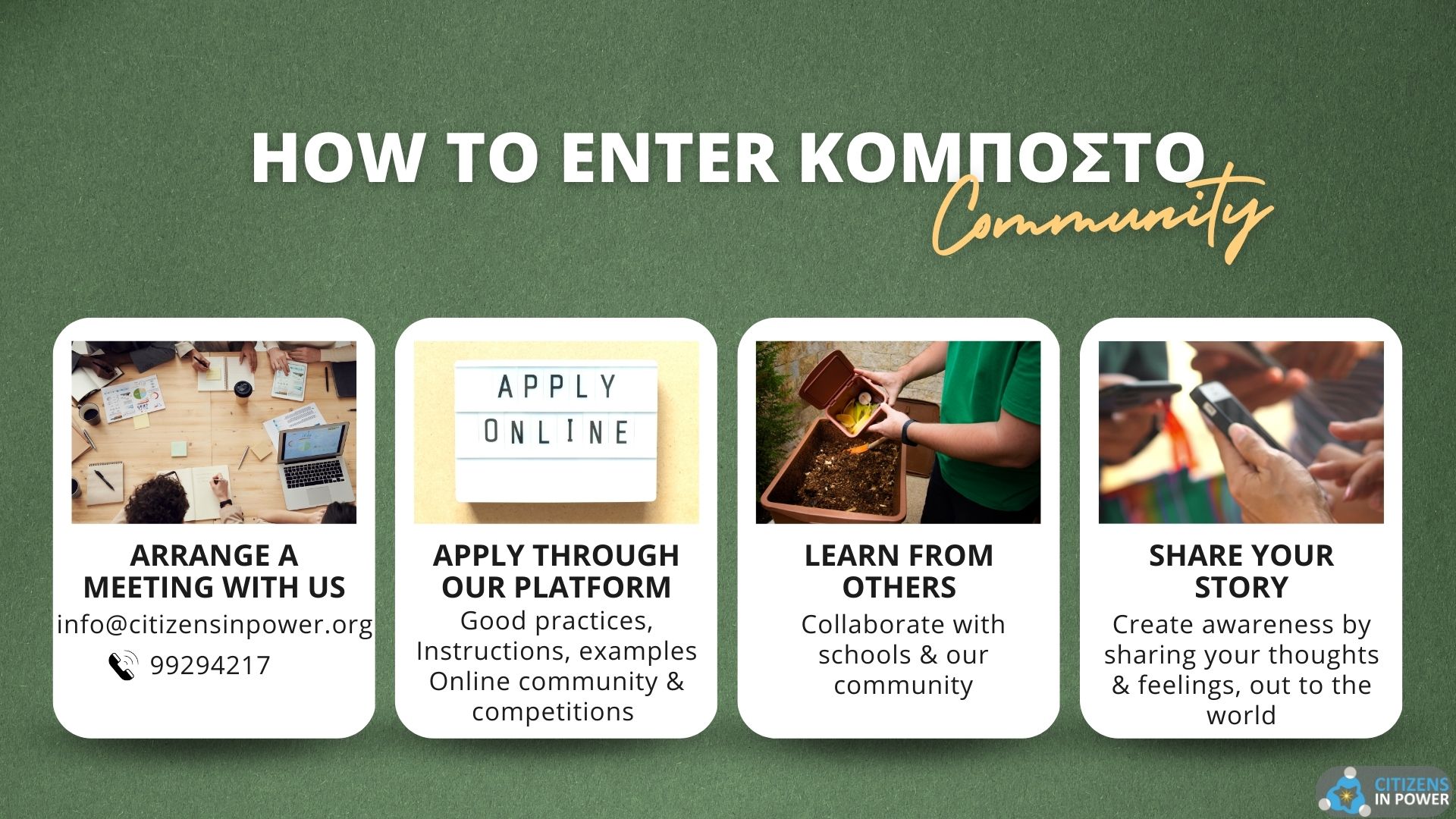 As an NGO, and feeling our responsibility towards society and communities, we have decided that it is important, especially nowadays, to create cooperation frameworks between different bodies, public and private organizations, companies, and communities to develop actions that create a positive social & environmental footprint. The goal of 'KOMPOSTO' - is to introduce & merge this initiative, in every family, and in every body of society, to teach them how and implement the 'KOMPOSTO' initiative in their daily life. This is done by mobilizing, sensitizing, and strengthening the communities and all these cooperative frameworks that exist in them. Our current target, of course, is the schools. We believe there is a different dynamic by engaging the schools since they can influence every family to include the compost initiative in their daily routine. By training educators, teachers (kindergarten, primary, and secondary schools), and students, of all ages, a new culture can be cultivated. With Phase A (training), Phase B complements and integrates the knowledge into action. Introducing composting bins (ready-made and build-in options) we invite educators with their students to start using the proposed methods of composting, to re-create organic nutritious fertilizer, that can be used in other running school activities (connecting to nature through gardening) and departments (permaculture). The outreach of 'KOMPOSTO' in many schools is critical as we envision creating composting communities. These could be at any scale (small, medium, large), in neighborhoods, municipalities, villages, urban & rural areas, and farms, and finally introducing processing food plants in smaller countries & islands like Cyprus where interregional terrain access is limited, transporting cost is very high, and of course environmentally inconvenient.