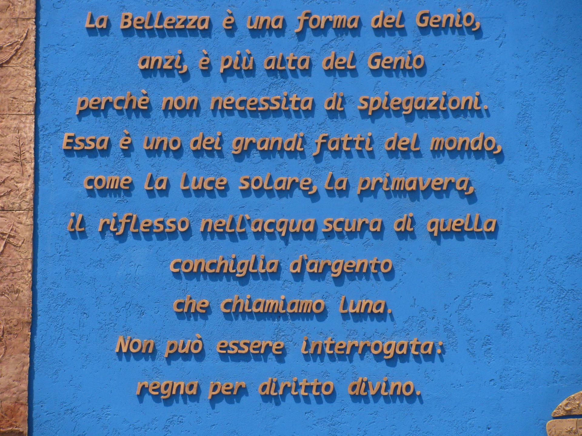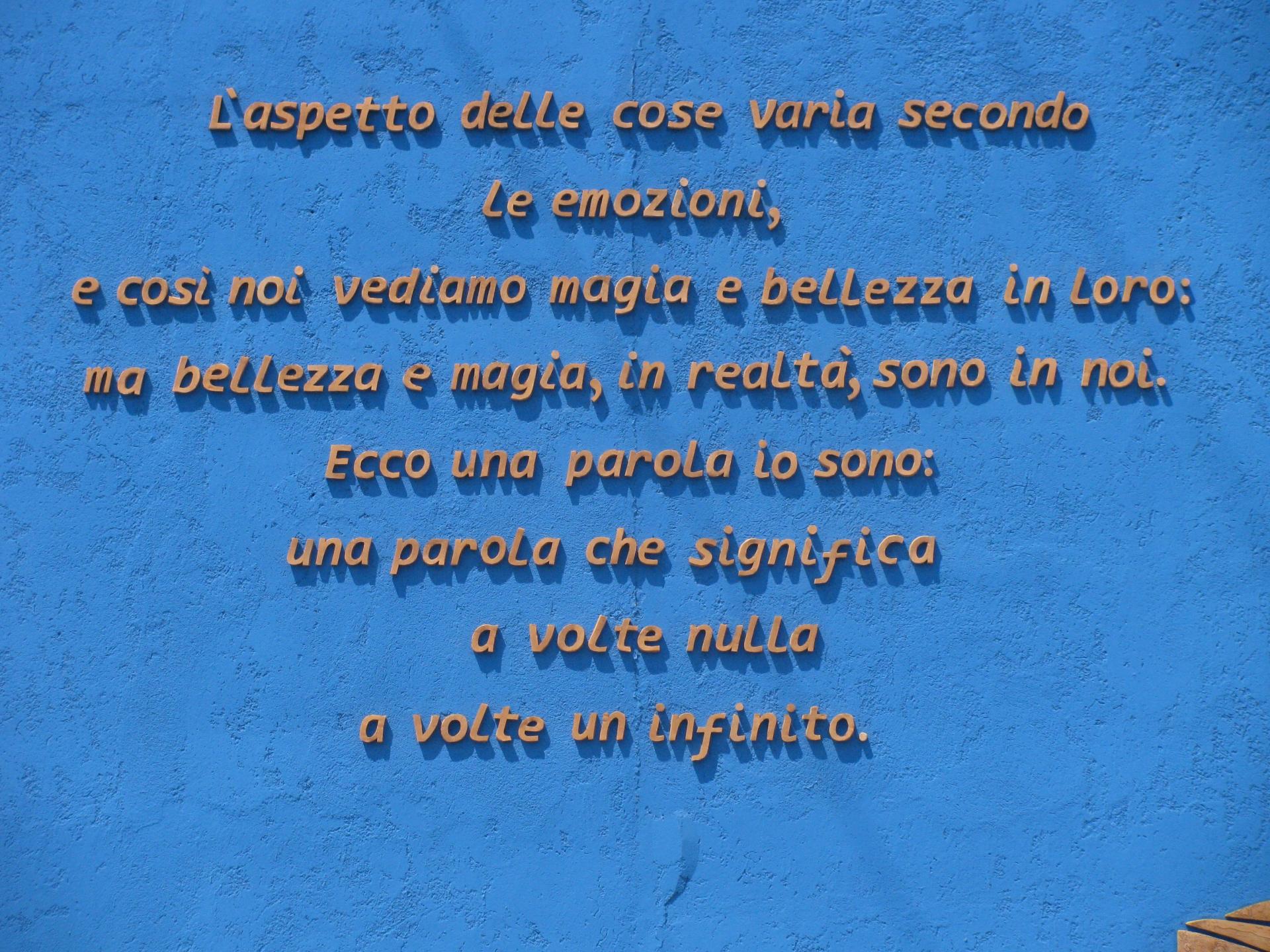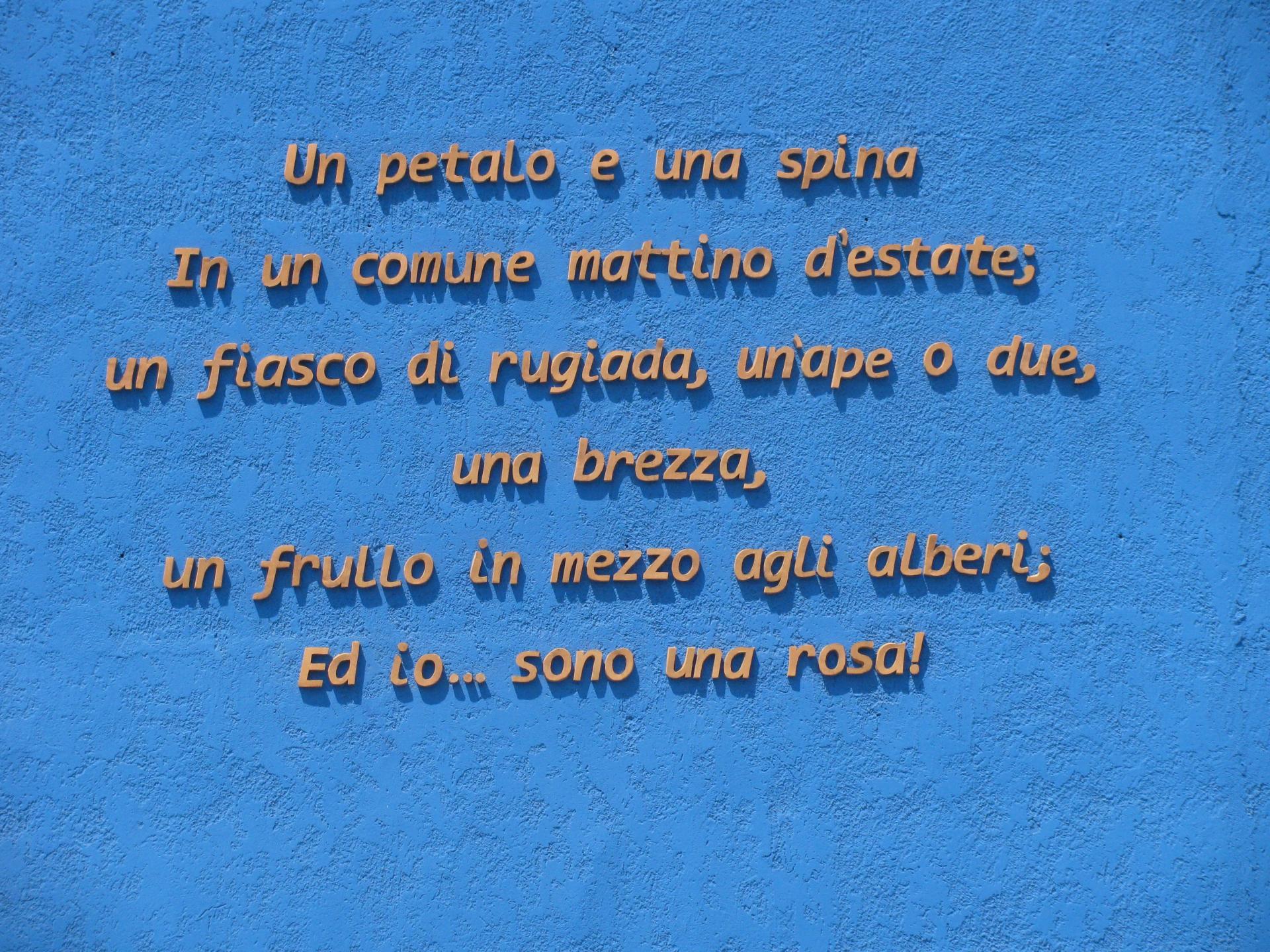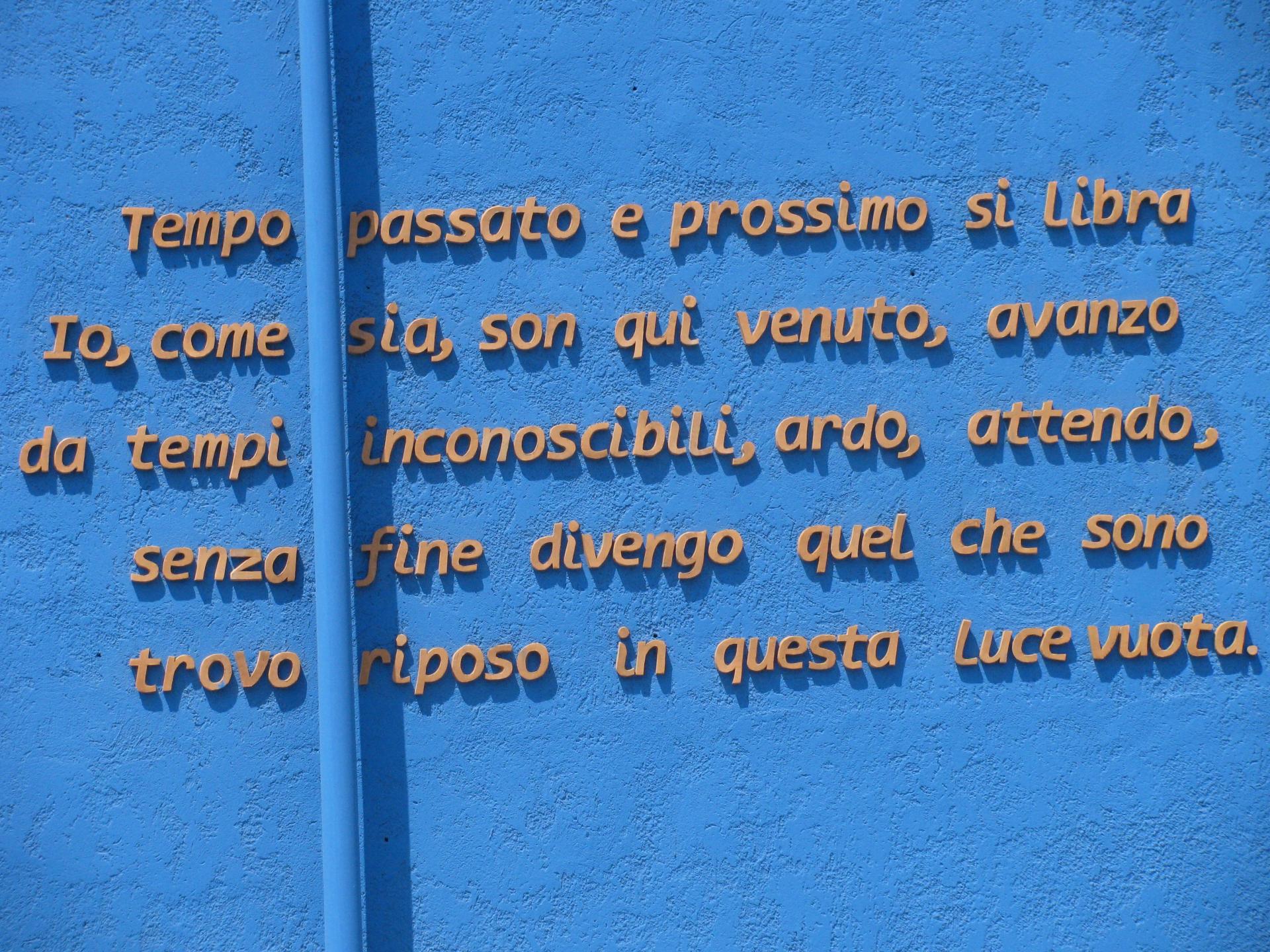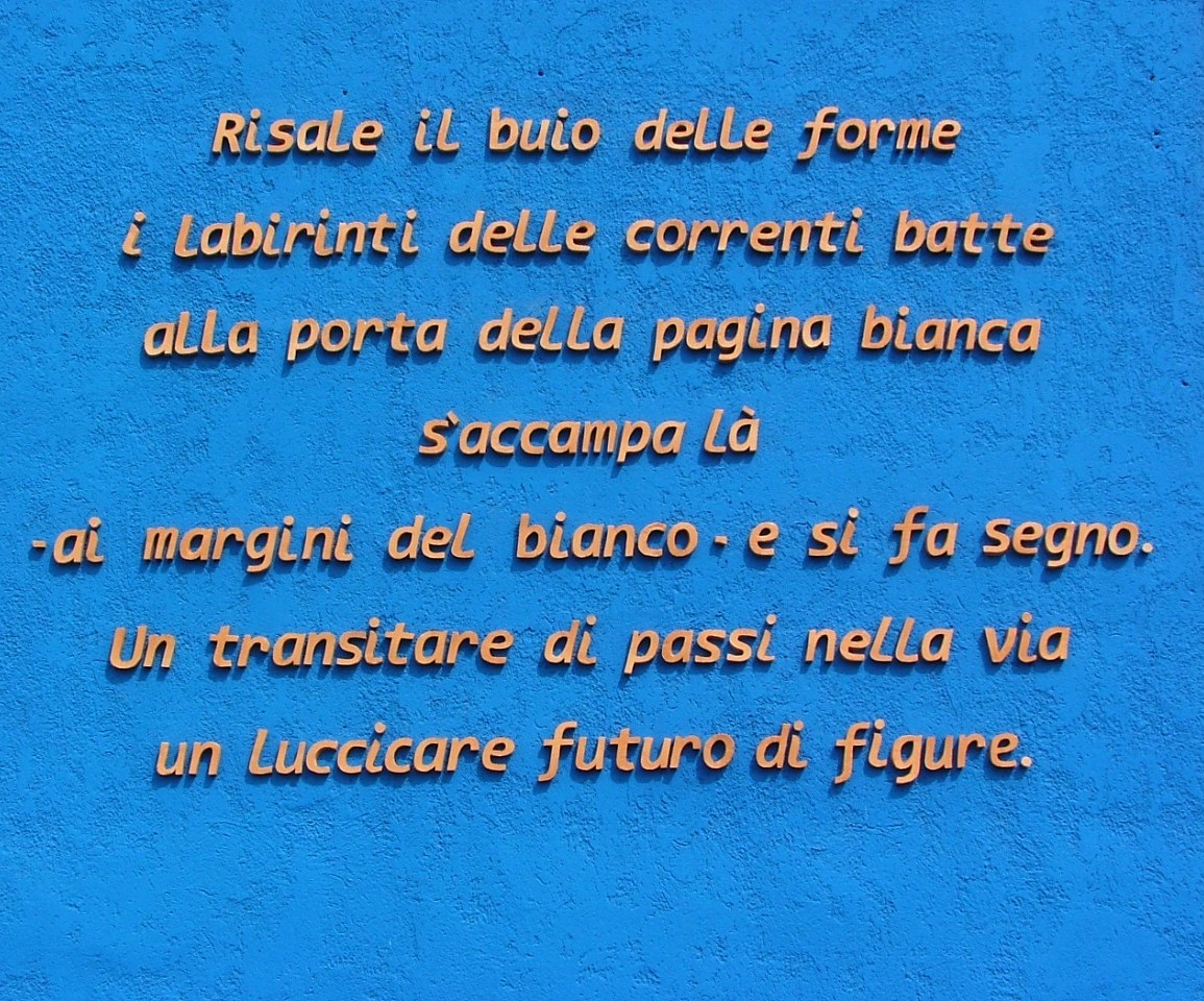 The part of poetries in between the above main installations belongs to Dante Alighieri, Oscar Wilde, Emily Dickinson, Giacomo Leopardi, Giorgio Caproni, Johann W. Goethe, Kamlil Gibran, Maria Attanasio, Mario Luzi, Nelo Risi, Vivian La Marque and Radindranath Tagore.
