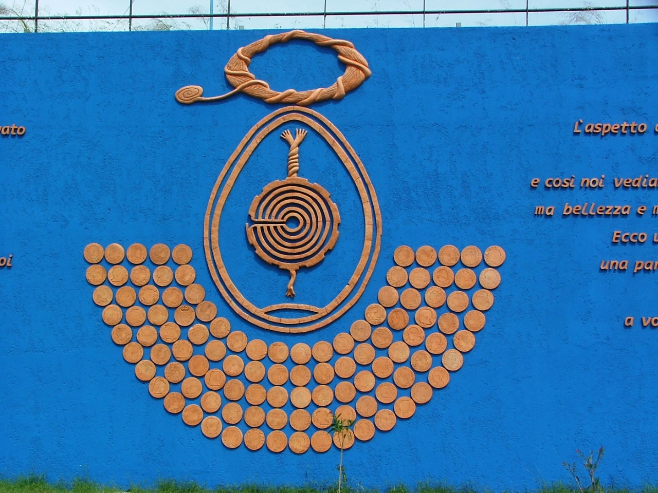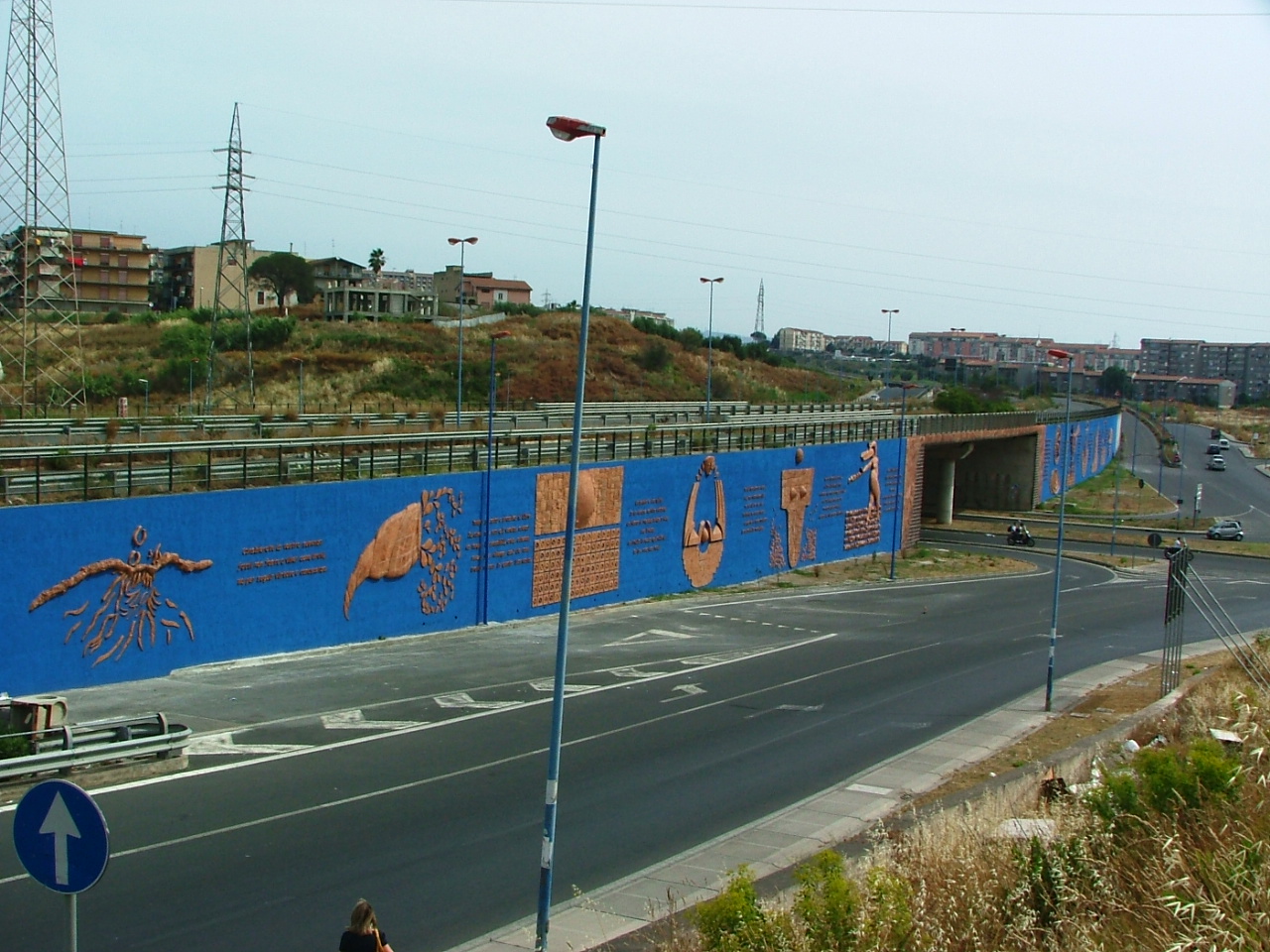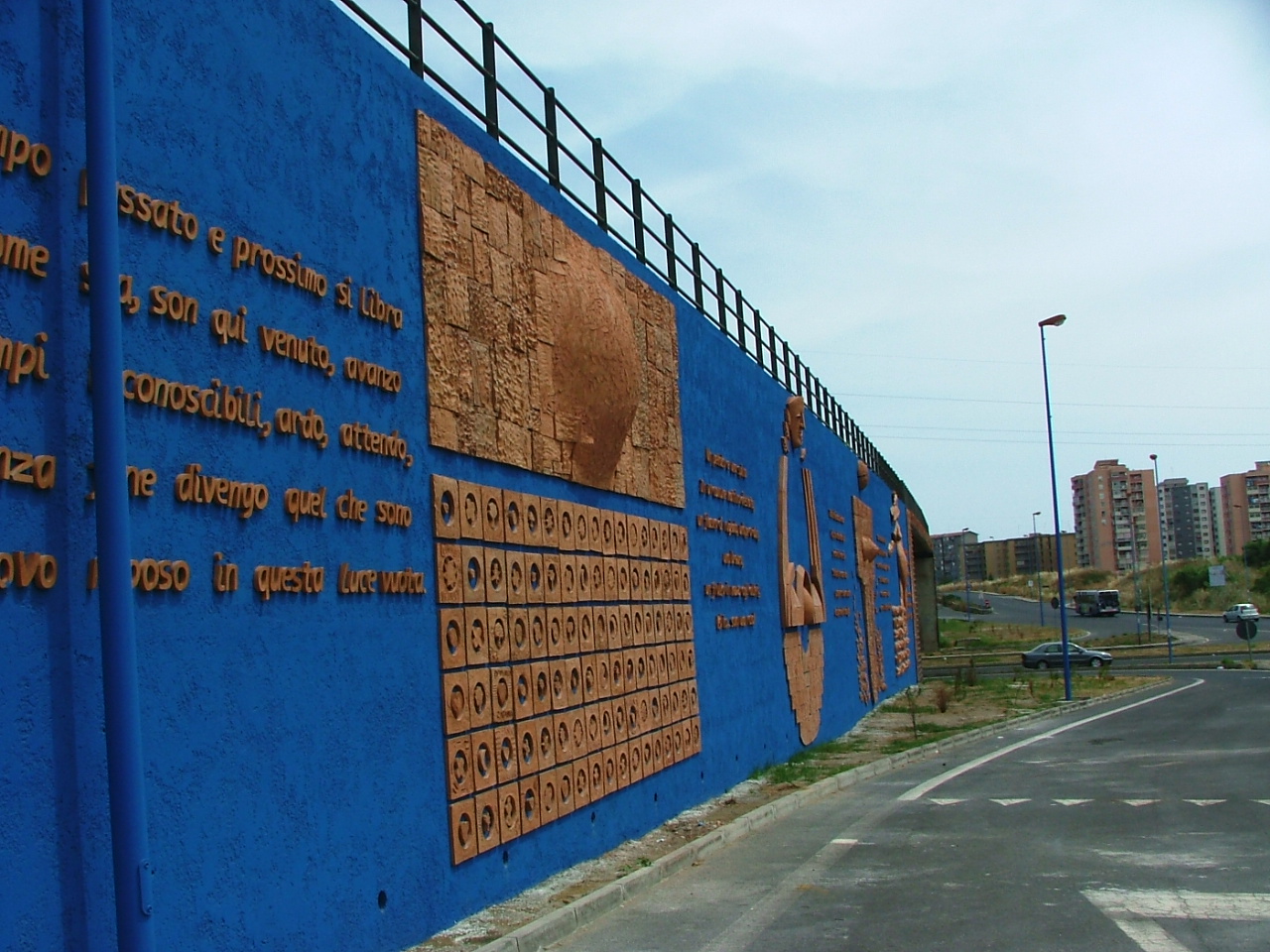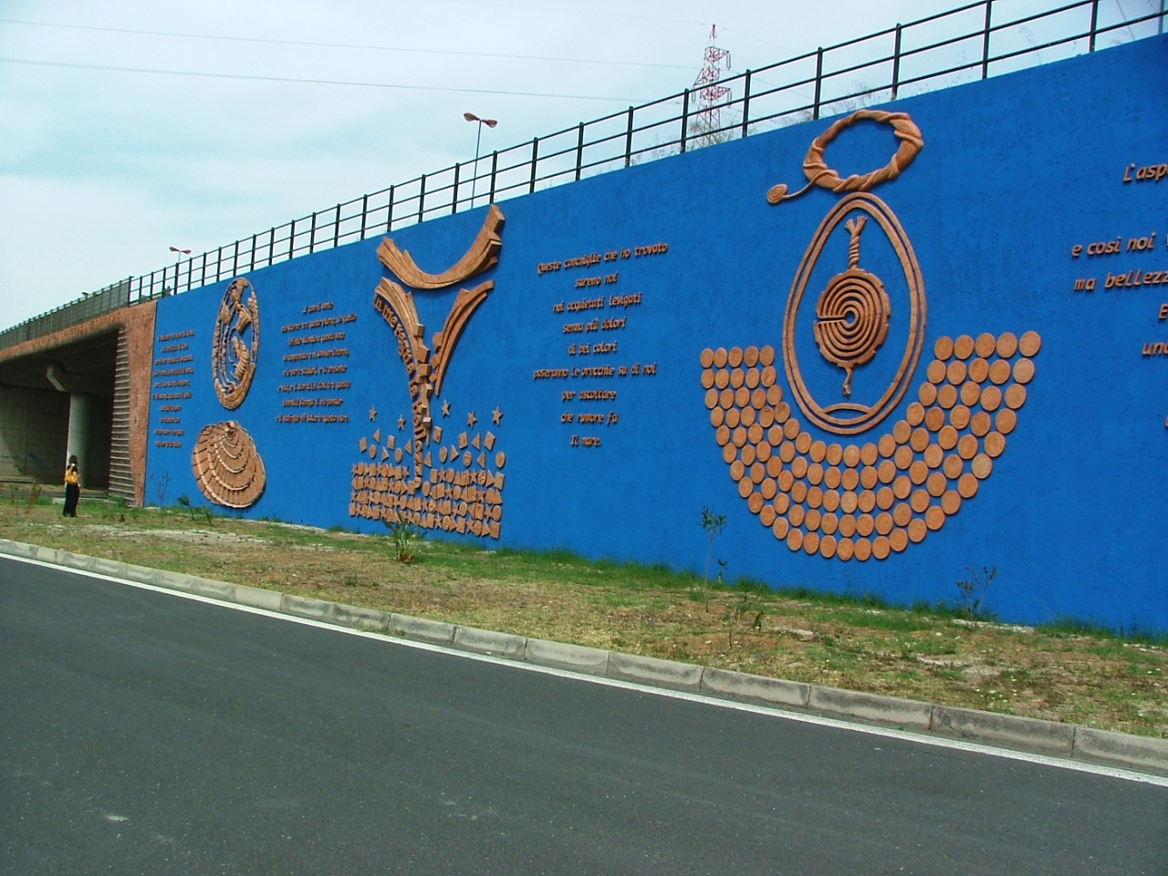 Motorway Palermo-Catania, junction Librino. This was the worst and dangerous marginal area in Sicily in terms of crimes, drugs and mafia. At the biggest roundabout, along 500 mt of concrete motorway's passage wall, Master Antonio Presti built in 2009 “The Beauty's Gate” (translation from the original Italian version the “Porta della Bellezza”), which is the biggest land art installation composed by 9000 artefacts/elements terracotta made in a school laboratory by the cooperative contribution of artists, art's student from college, 2000 children and their mums. The“Porta della Bellezza”contains 13 big main art installation and 13 poetries in between. This installation is applied on a cobalt blue wall and the main theme of it is “The Big Mather”. The terra cotta, nature-based material, identifies the circularity and sustainability of this project. So far, neither vandalism or disparaging acts have been perpetrated there. In Librino, periphery and matriarchal land portion in Northern East Sicily with 75000 habitants, women are holding the heavy weight of their family. Since 1990’s, people in Librino have been victim of long-suffering, violence and poverty on a both consciousness and economic level, especially female and kids. The Vision of Antonio Presti is to bring back to women their sacral dimension on a sort of symbolic and metaphoric huge altar, created by the cooperative and intra-generational engagement and exchange of artists, young students and mums. Now, in Librino, new values are raising such as dignity, honesty, vision and kindness. Throughout the love to realize a little piece of terra cotta, each person will respect the value and the beauty of a mum, therefore, respect into the Community and the same for further coming generation. From Antonio Presti's Gift to Librino to a social identity, from a"no-place"with"no-identity" to a home. It’s a symbolic transformation translated into reality. Art is either a therapy to heal a wound and a tool to became free.