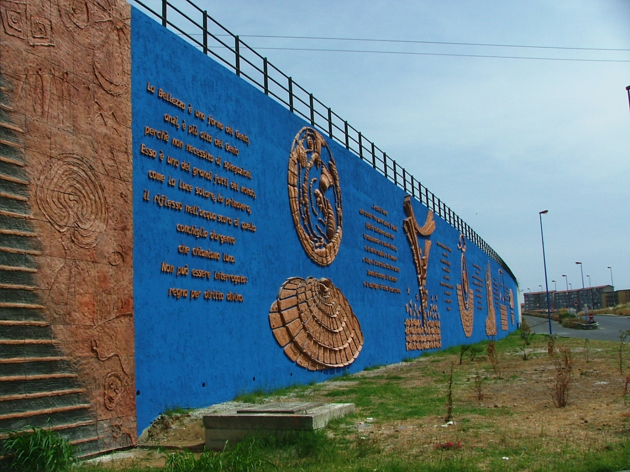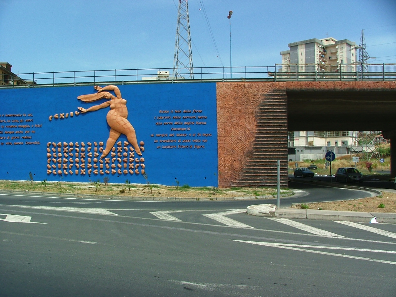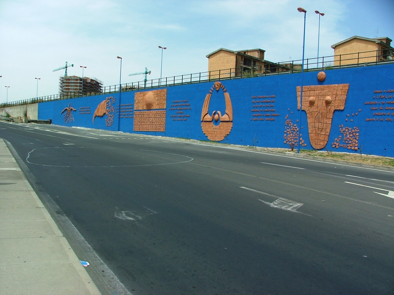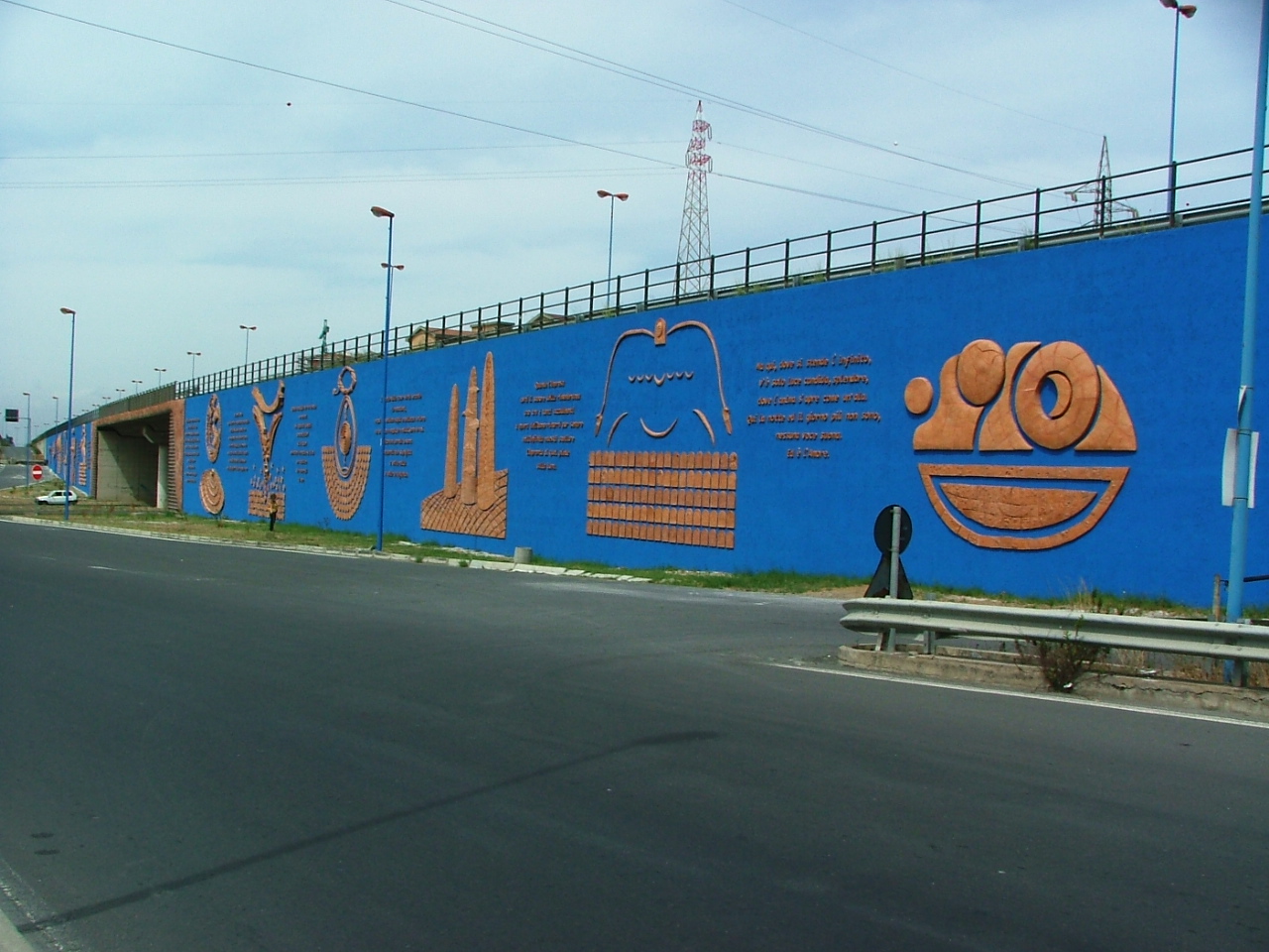 Motorway Palermo-Catania, junction Librino. This was the worst and dangerous marginal area in Sicily in terms of crimes, drugs and mafia. At the biggest roundabout, along 500 mt of concrete motorway's passage wall, Master Antonio Presti built in 2009 “The Beauty's Gate” (translation from the original Italian version the “Porta della Bellezza”), which is the biggest land art installation composed by 9000 artefacts/elements terracotta made in a school laboratory by the cooperative contribution of artists, art's student from college, 2000 children and their mums. The“Porta della Bellezza”contains 13 big main art installation and 13 poetries in between. This installation is applied on a cobalt blue wall and the main theme of it is “The Big Mather”. The terra cotta, nature-based material, identifies the circularity and sustainability of this project. So far, neither vandalism or disparaging acts have been perpetrated there. In Librino, periphery and matriarchal land portion in Northern East Sicily with 75000 habitants, women are holding the heavy weight of their family. Since 1990’s, people in Librino have been victim of long-suffering, violence and poverty on a both consciousness and economic level, especially female and kids. The Vision of Antonio Presti is to bring back to women their sacral dimension on a sort of symbolic and metaphoric huge altar, created by the cooperative and intra-generational engagement and exchange of artists, young students and mums. Now, in Librino, new values are raising such as dignity, honesty, vision and kindness. Throughout the love to realize a little piece of terra cotta, each person will respect the value and the beauty of a mum, therefore, respect into the Community and the same for further coming generation. From Antonio Presti's Gift to Librino to a social identity, from a"no-place"with"no-identity" to a home. It’s a symbolic transformation translated into reality. Art is either a therapy to heal a wound and a tool to became free.