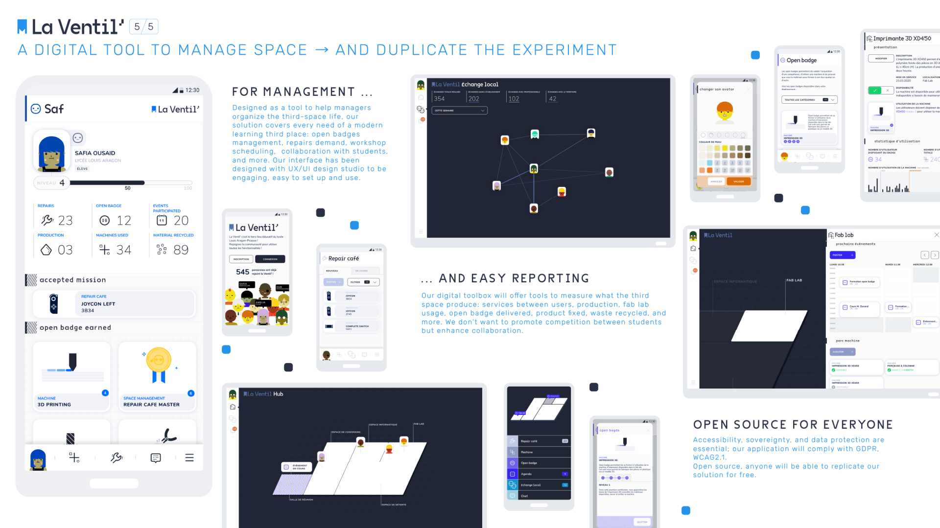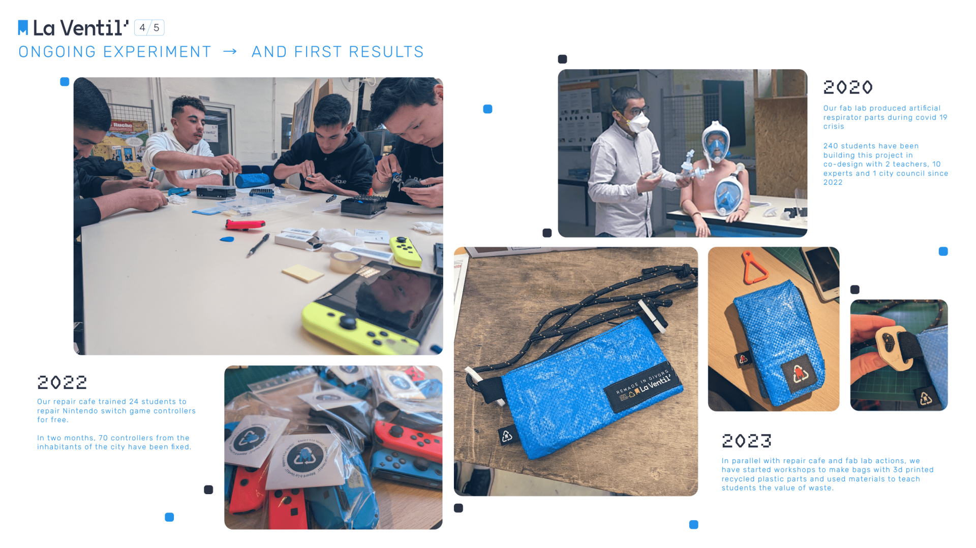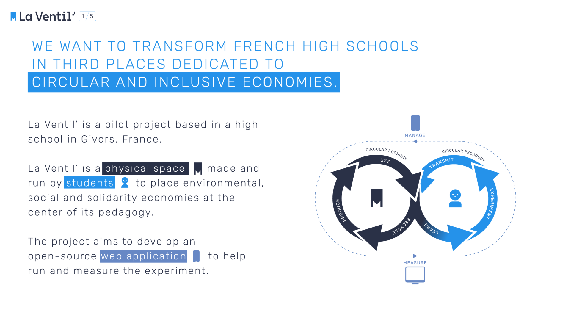 La Ventil’ aims to create third places of educational innovation in French high schools. Our goal is to change how we teach technology and manufacturing by creating new pedagogy with circular and inclusive economies at its center to transform students into sustainability champions.