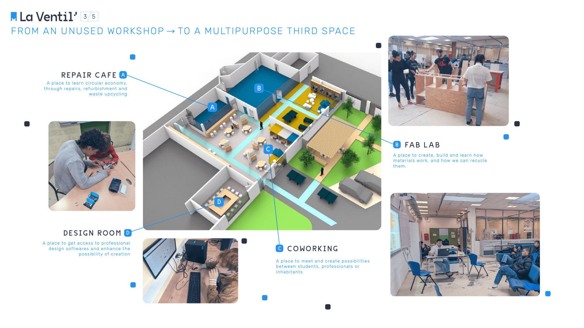 Today La Ventil’ is equipped with a fab lab, a repair cafe, a design room, a coworking space.