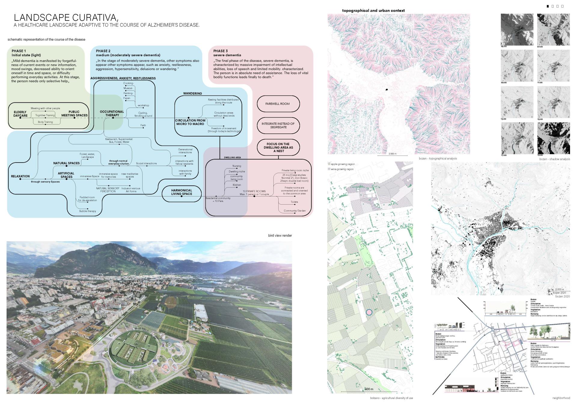 Landscape Curativa is an environment that helps Alzheimer‘s patients to lead a self-determined everyday life in the different stages of the disease. The holistic approach includes a variety of offers for those affected and their families, from daycare to in-patient treatment, as well as offers for the neighborhood. The aim is to demonstrate a counter-position to the architectural attitude of isolating a care facility from society and to work out synergy effects. An overview of Alzheimer‘s disease and its spatial implications led to an analysis of the architectural context with different case studies. On this basis, the developed project uses its own design for a new type of care facility as a healthcare landscape.