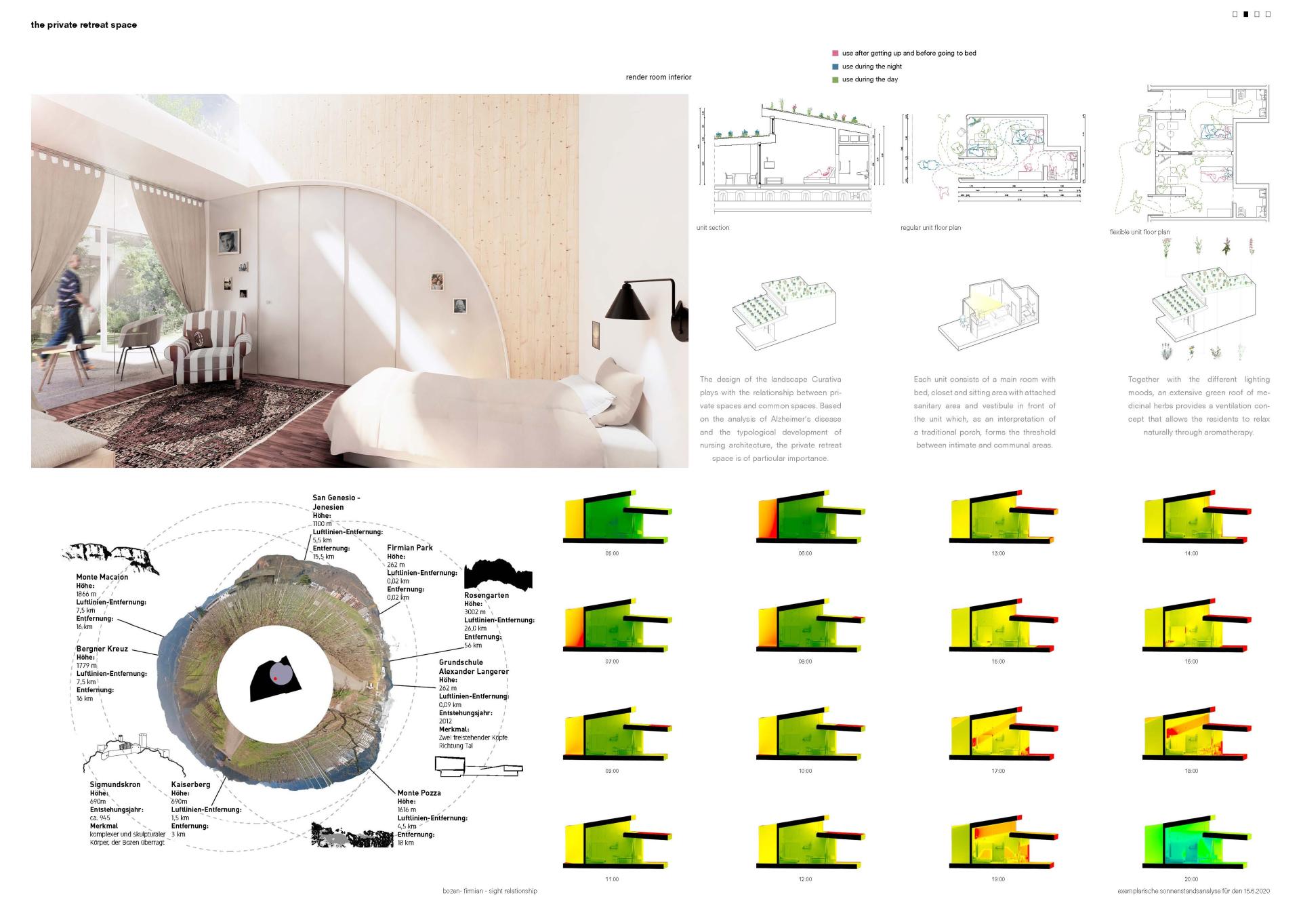 This Landscape Curativa is an environment that helps Alzheimer‘s sufferers to self-determine everyday life in the various stages of the disease. The holistic approach includes a wide range of services for affected persons and their families, from daycare to inpatient treatment, as well as offers for the neighborhood such as childcare, medical care, and shopping facilities. The aim of the Landscape Curativa is to show a new strategy in contrast to the conventional architecture of isolating care facilities from society and to merge synergy effects through a radical crosslinking of the center in the environment way before the worsening of the disease.