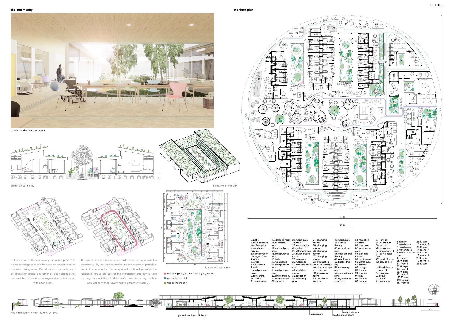 The spatial methodology sees the rejection of the conventional linear model of nursing homes through the model of a miniature safe city where residents can live the day with maximum individuality through the loop walking approach where a free development of their own everyday routine is made possible individuality come to the foreground.