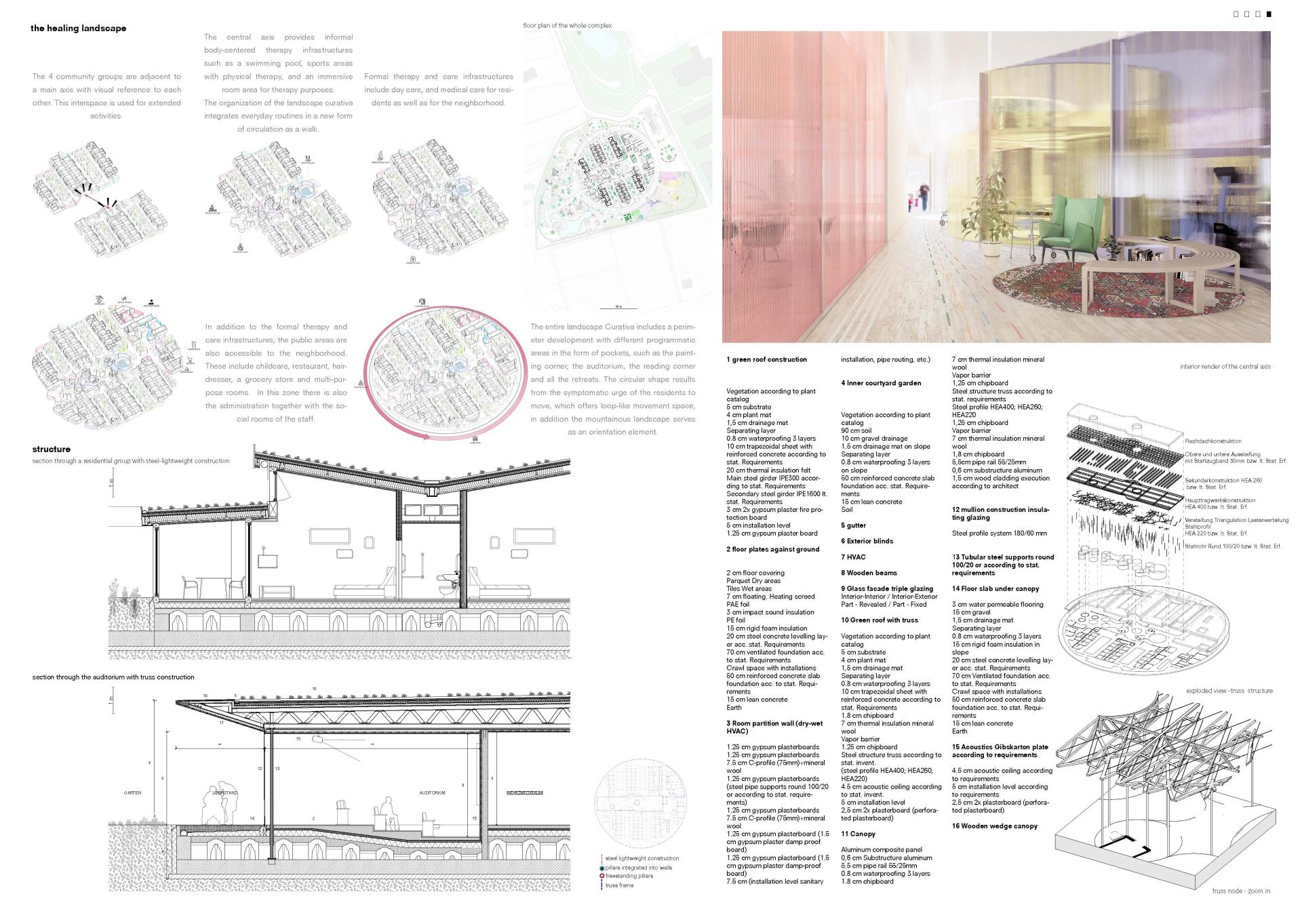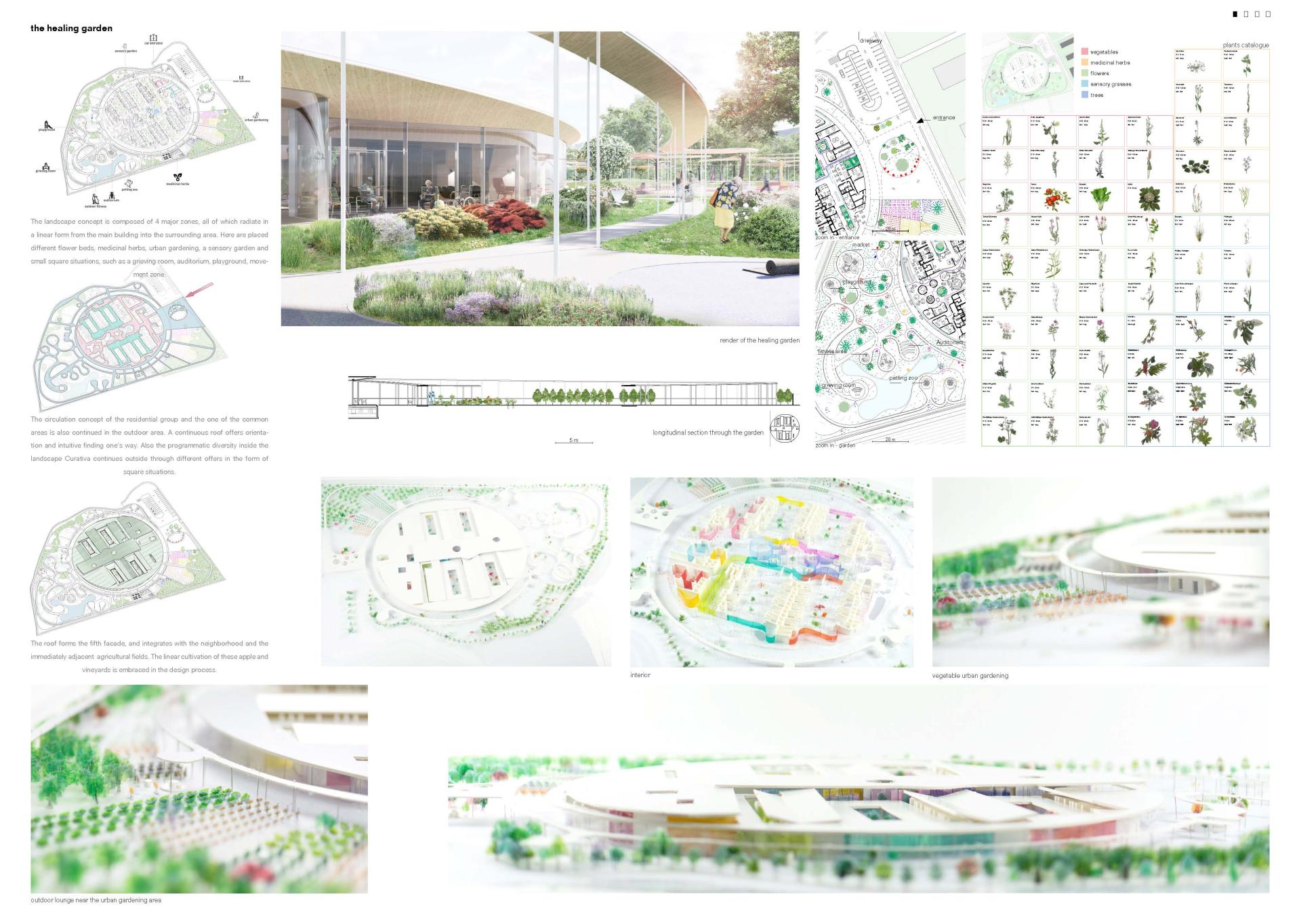 The design plays with the relationship between private and common spaces. Based on the analysis of Alzheimer's disease and the typological development of care architectures, the private retreat space is of particular importance. This place becomes a familiar environment for the resident through personal objects from earlier times. The resident is free at any time to withdraw from the community in a self-determined manner and to find peace in their own room. Each unit consists of a main room and vestibule facing a patio in front of the unit, which is an interpretation of a traditional porch and forms the threshold between intimate and communal areas. The circulation system intends to encourage the residents to interact with each other offering a wide range of spatial qualities from intimate to public. The familiar character promotes identification with the community. The many viewing relationships within the group are part of the therapeutic strategy of training the cognitive abilities of those with Alzheimer's disease through subtle stimulation. The communities are integrated into a health landscape with a wide range of offerings from formal therapy rooms to informal activities that arise spontaneously integrating everyday routines into a new form of circulation as a walk. In this way, the respective care is composed of individual care services for every stage, as the course of Alzheimer's disease is very dependent on the person. In addition, there are offers that help to integrate the neighborhood and create synergy effects such as childcare, multifunctional spaces for the neighborhood, etc. The Landscape Curativa surrounds a health garden adjacent to agricultural fields where linear cultivation is incorporated into the design process. Here, four main zones all of which radiate in linear form from the main building into the surrounding area provide a range for sensory stimulation and are open to the neighborhood, and provide a stage for daily stories.