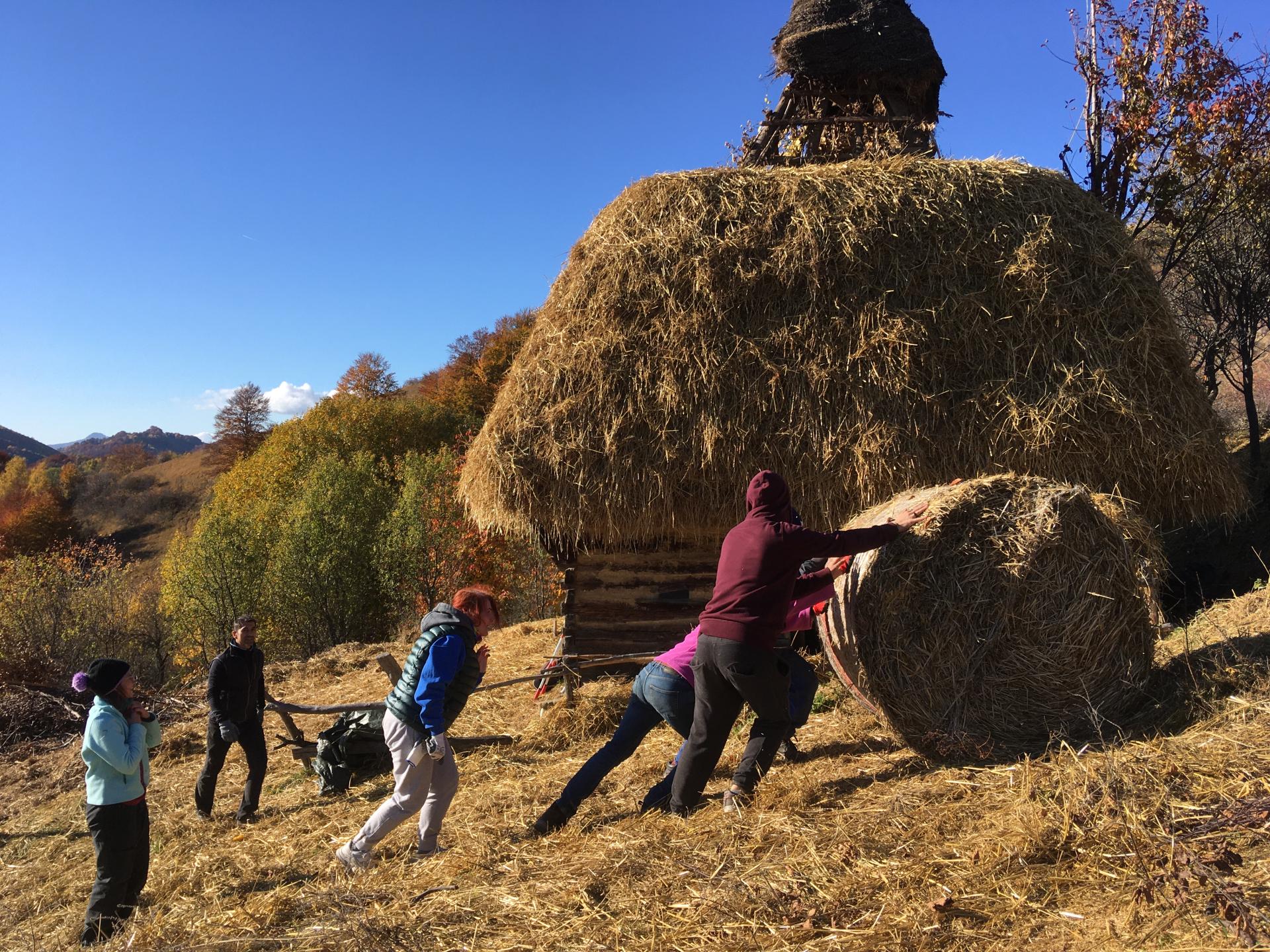 Although the remoteness of the Intregalde village, home of our camp, favored the conservation of traditional architecture and life style, it is also the cause of bad social integration for the villagers. The situation is similar in most rural areas of Romania, creating a social gap between people from the city and those in the country sides; our project aims to narrow this gap through our activities and empower the locals. In numerous occasions we visited and helped the villagers with their work or even with using their newer gadgets. The help returned often and our neighbors, some traveling over 5 km, came to help us with restoring the straw roof. This also made us feel included in their village.