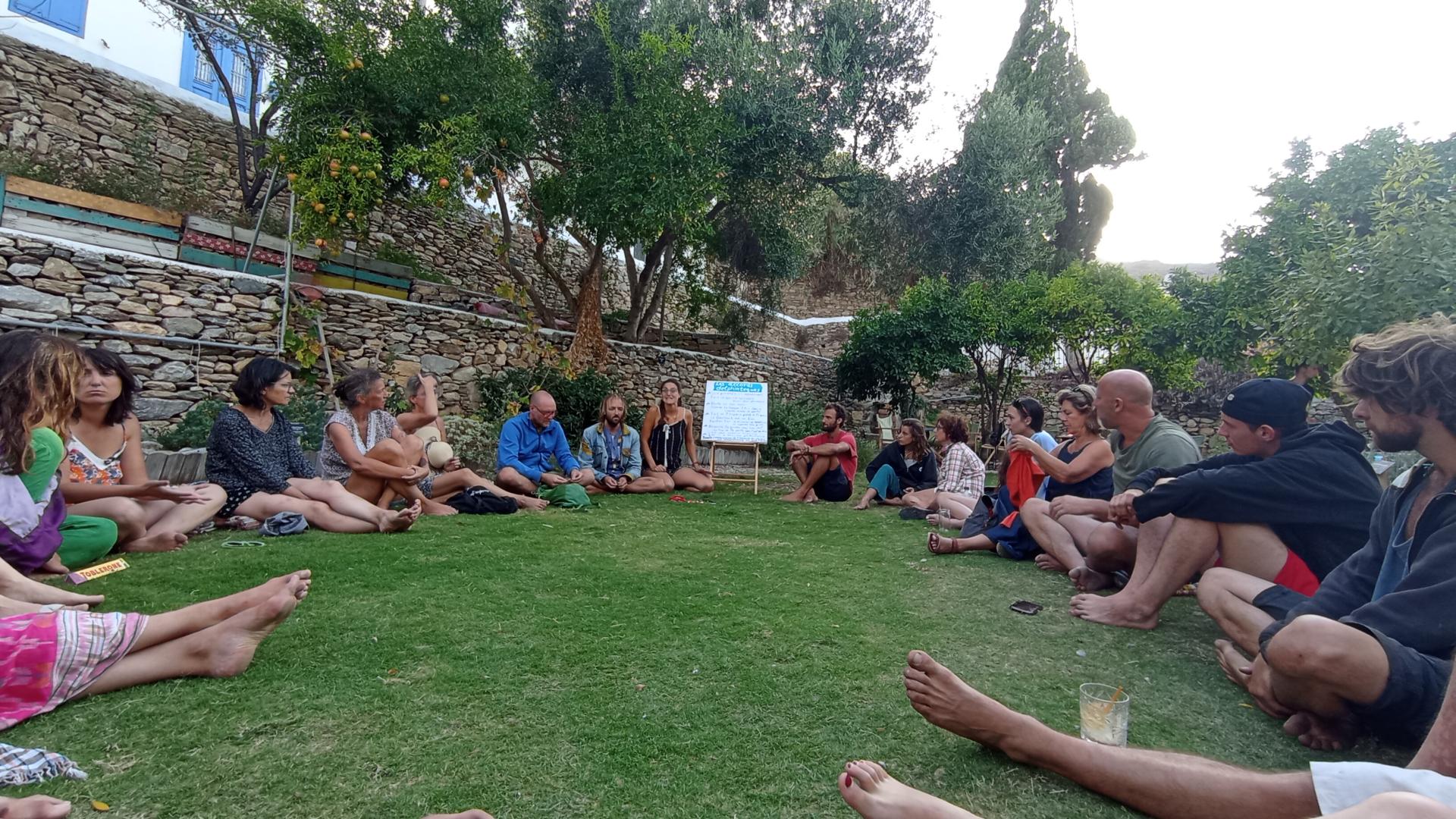 Our mobilities prioritize lower-carbon transport (sailboats, bicycles, hiking) and venues exemplifying voluntary simplicity (zero plastic, local organic food) for ecological footprint awareness. Learning processes include nature-based activities like hiking, dolphin swimming, and participatory eco-construction workshops, fostering an understanding of ecosystems and a relationship of care towards Nature. Participants engage with professionals leading sustainability initiatives, such as partners at Amorgos Botanical Garden, Romain Cavillon of the Northern Lights agroforestry project, and local associations like the Mitato of Amorgos and Agni Center. These experiences provide valuable insights into eco-construction, permaculture, and ecological nutrition through workshops with specialists like Theodosia Stathi and Olivia Paranos.