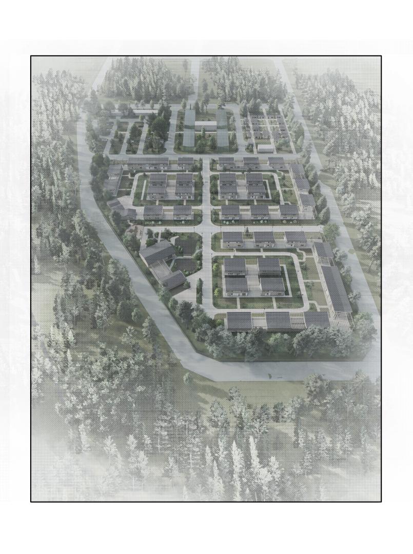 Housing developments of the future. Design of low-tech houses as a response to the needs of large groups of people in crisis situations (on the example of refugees in Ukraine), located in the vicinity of the Kampinos National Park and Warsaw. Project raises issues related to construction technologies that respect the limited resources of our planet.