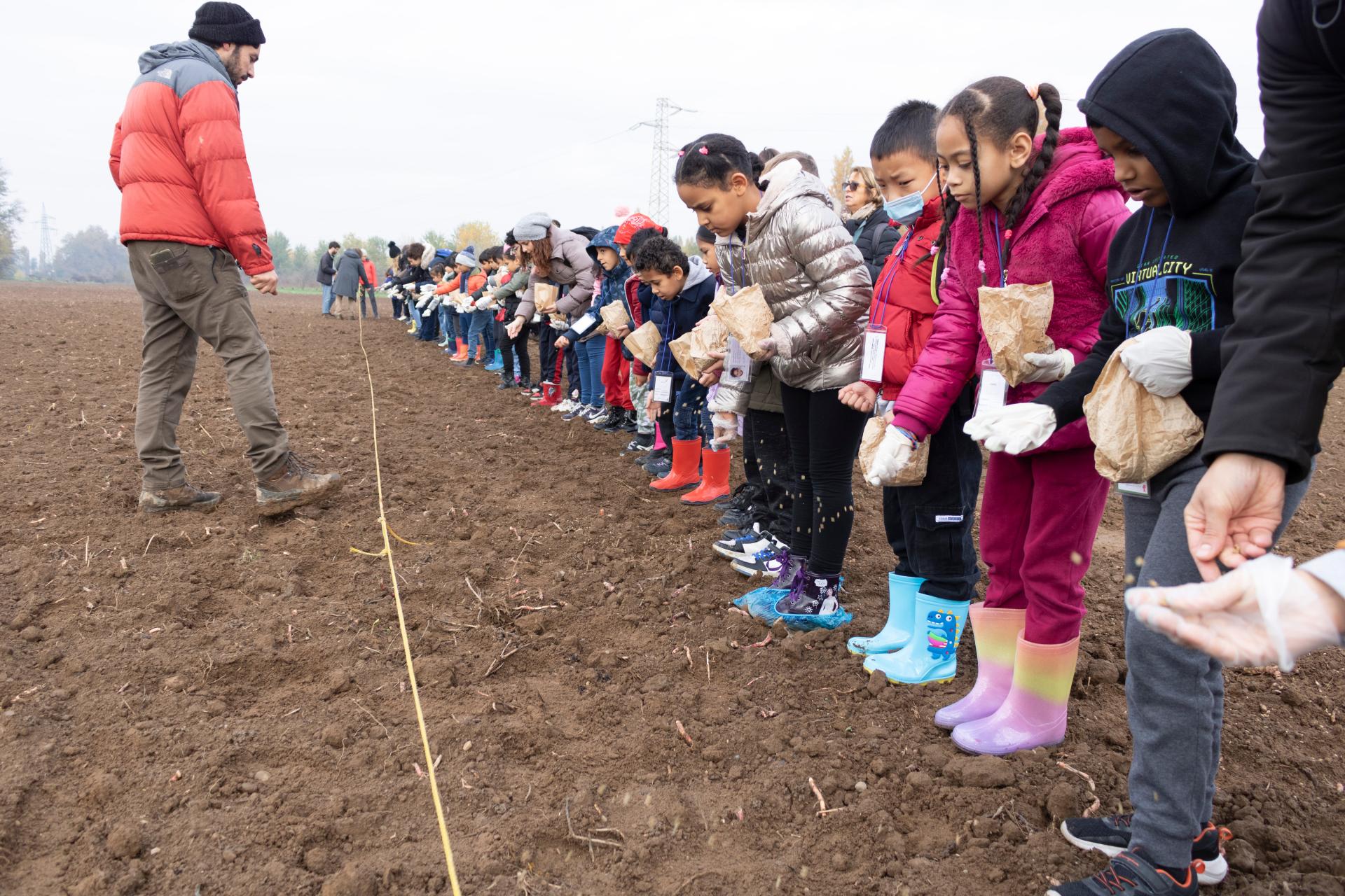 During the first year of MadreProject’s experimentation, 1 hectare of agricultural fields was also sowed with ancient grains and regenerated with the involvement of 1000 children from local kindergartens and primary schools, to build a “Biblioteca del Grano” (Grain Library) and connect [II] different people (children, families, teachers, citizens) conveying the importance of local bread production and short supply chain.