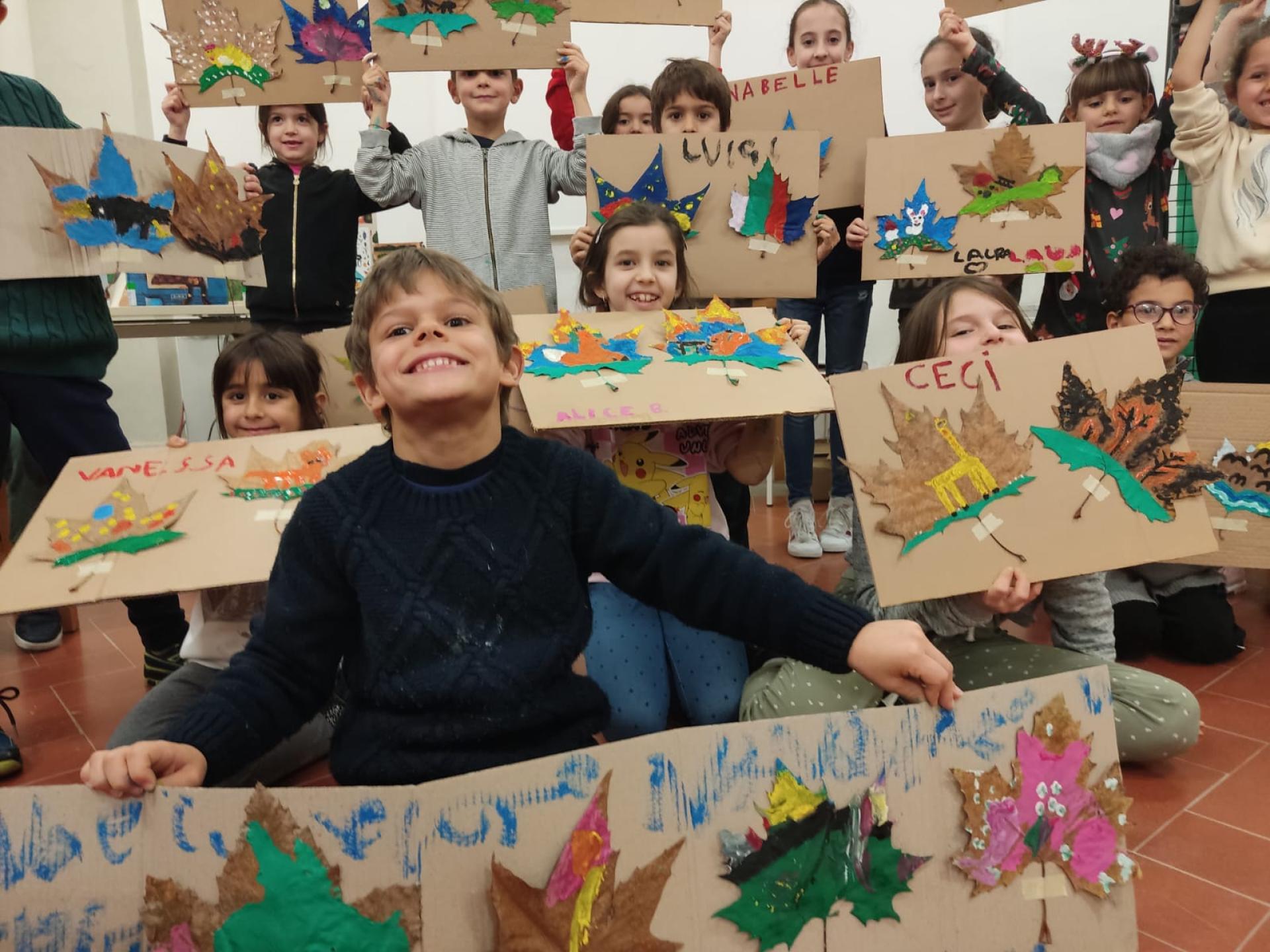 Children gather at libraries in the urban and rural areas around the city of Lugo for multiple meetings. They are called to imagine what trees they have seen throughout their lives and draw them on the canvas of fallen leaves. They draw the shape of the leaves or the birds or insects that make up the ecosystem of the tree over the various seasons. Each session begins by reading a story set around a tree and narrated by illustrator Irene Penazzi, who then leads the workshop. Afterwards, the children trundle home, clasping their masterpieces in their happy hands, to share with friends and family alike. In preparation for yet another activity the students spent several days searching for suitable leaves, both around the plexus and outside the school. They were tasked with creating autumn portraits starting from their own caricature, to be later adorned with dried autumn leaves.One student commented that the experience helped her see herself as part of nature, adorned with wild beauty, and that trees are “magical because they color the leaves with warm colors.”