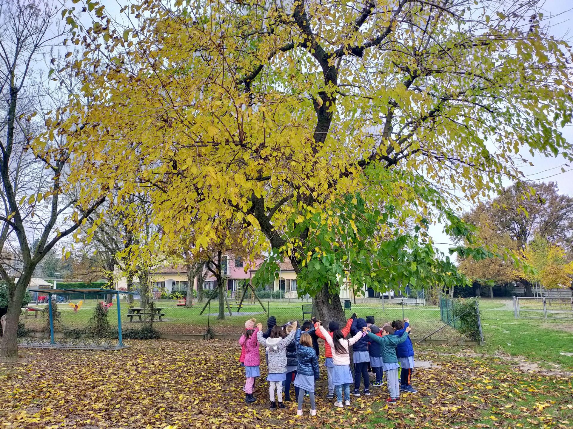 During the first activity, the children surround the large tree in the garden of the elementary school in a strong spiral embrace that allows them, in the mid-morning silence, to listen to the rustling of the leaves and to observe with upward glances the deep yellow color of the leaves. Afterwards, during the reflection circle, child after child shared that this experience gave them new eyes to see with a gaze of curiosity and wonder, and one added that they liked “hugging trees because it relaxes me.”