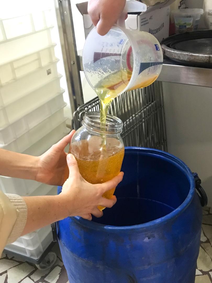 Through this process of exchange, we got in contact with a kebab shop owner, with whom we could cooperate. The act of regularly collecting leftover oil built the basis for a partnership, not only for oil supply but for an exchange of soap-related knowledge and social interventions right in front of their shop.