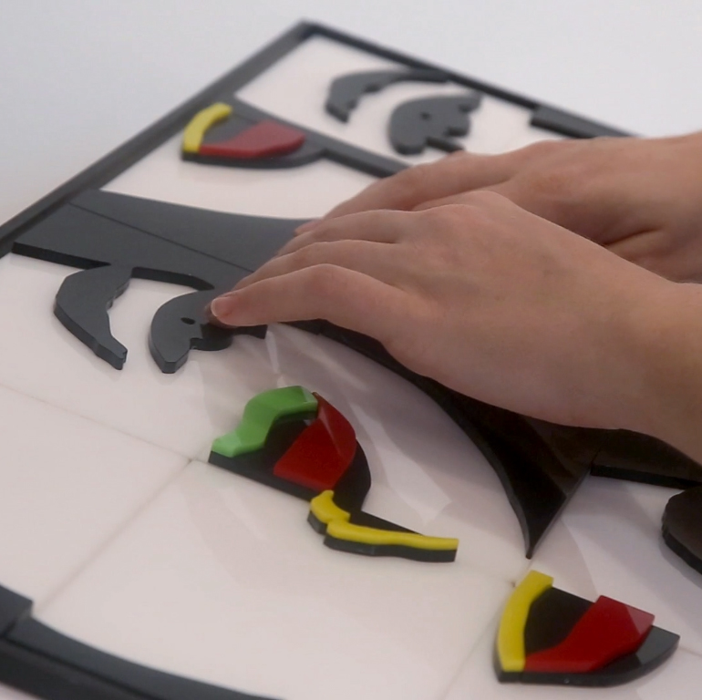 The selection of artworks was based on two main criteria: to make the wide spectrum of contemporary art accessible and to showcase as many genres of art as possible. Therefore artworks in the form of painting, silk-screen printing, traditional and kinetic sculpture, installation and assemblage were included. In order to find the most appropriate way of tactile reproductions, research was conducted combined with the constant feedback of the focus group, in order to render the main aesthetic characteristics of each artwork with respect to each artist’s unique idiom. Also the materials used for each representation were carefully chosen in order to provide a rich tactile experience. For 2 artworks, the museum management granted permission to be available for tactile exploration in their original form by all visitors. For the other 8 artworks, tactile representations were created using 3D modeling & 3D printing, laser cutting, custom design and UV/raised ink printing. For the 3 artworks by the artist Takis, Sonic, Signals, and Musical, three interactive museum-educational boxes were designed by Katerina Bakaliou using sound, electromagnetic power and other interactive objects to translate colours into sound and transfer the essence of the artist’s practice and vision. For each artwork audio descriptions were produced, accessed through an accessible website. Additionally, the solutions applied propose the participation of the user to serve their purpose. This kind of interaction changes the established rules of conduct in a museum space, turning the visitor from a passive spectator to an active participator able to select the desired level of interaction.