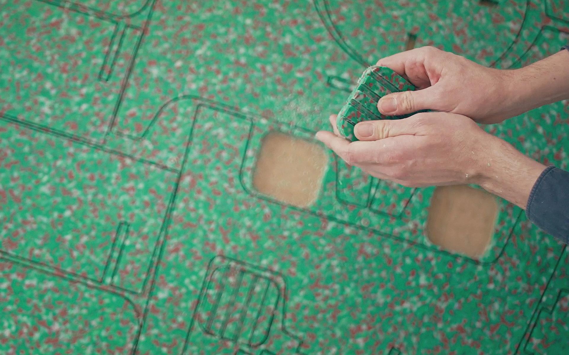 Conscious production: The pieces are CNC milled optimizing the sheets to the maximum, to implement our circular design concepts the off-cuts go back into recycling to create new sheets or other MiNiMONO products. From each sheet we use we have a maximum of 10% in off-cuts left, on some designs we get only 18gr per Kilo.