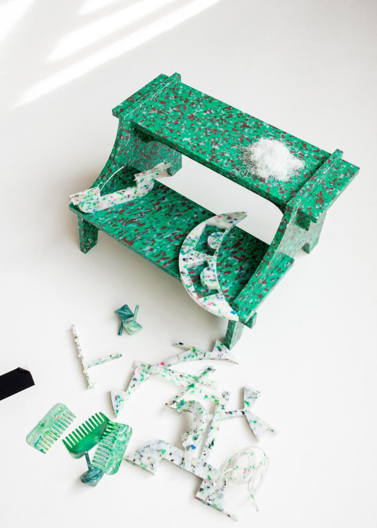 Since we started this project in October 2021 we have produced furniture with a total weight of 1.822kg of recycled plastic which is the equivalent to 35.725 detergent containers.