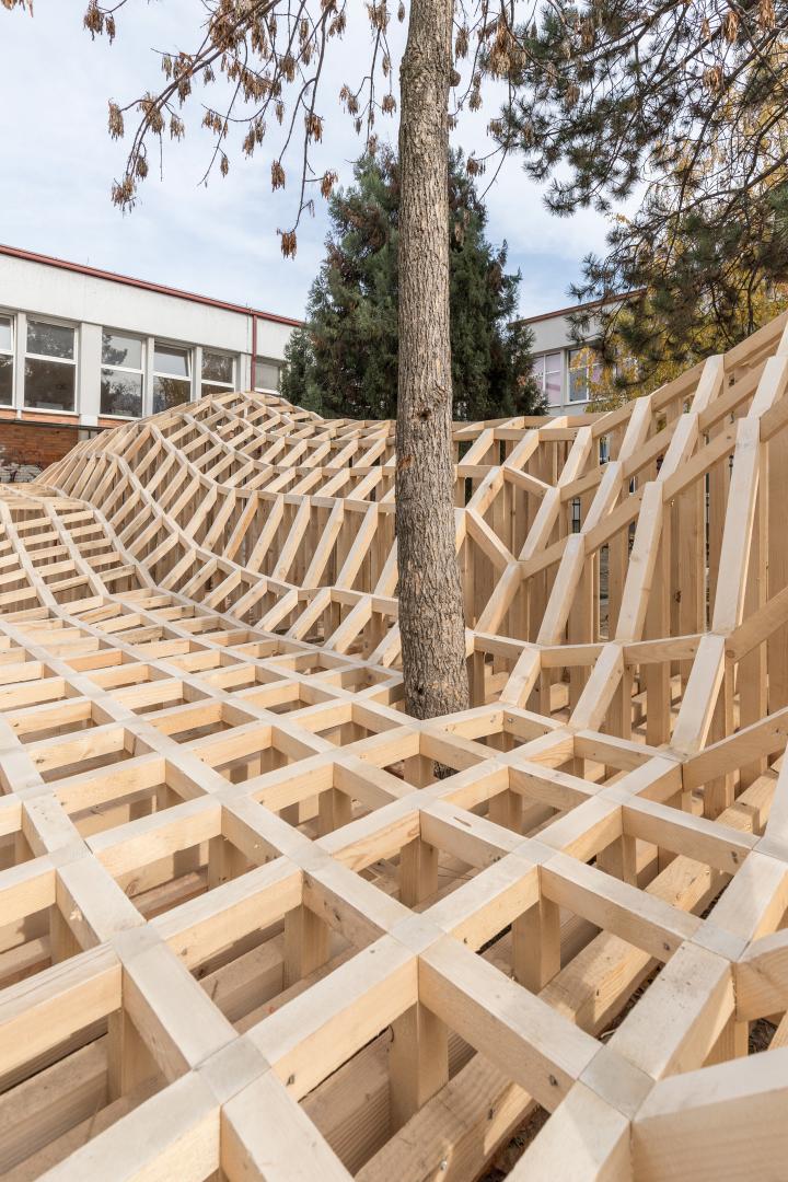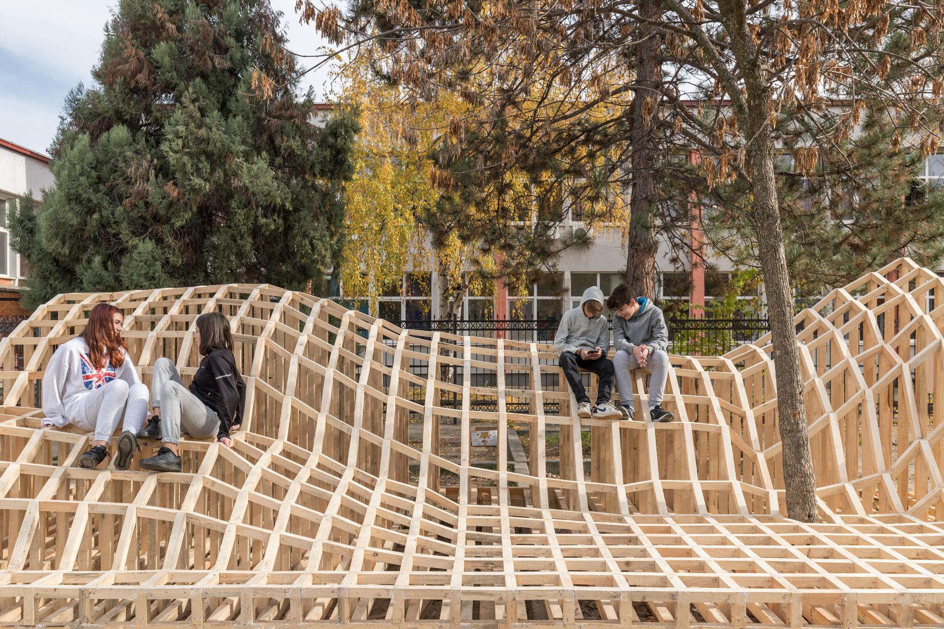 They were guessing if it was going to be a huge frozen wave. This helped develop their imagination and direct connection with the changes of the public space in their first environment, their schoolyard. Some of the children already started drawing the intervention at home and came up with ideas on how we should improve it or change it in the future. This communication was so interesting for us as architects and builders. When we built up the intervention, the children couldn’t go down from it. The entire school was sitting, going up and down, trying new sitting positions, and experimenting with the positions. Also, one local dog came up with the children who found it as a playable activity.
