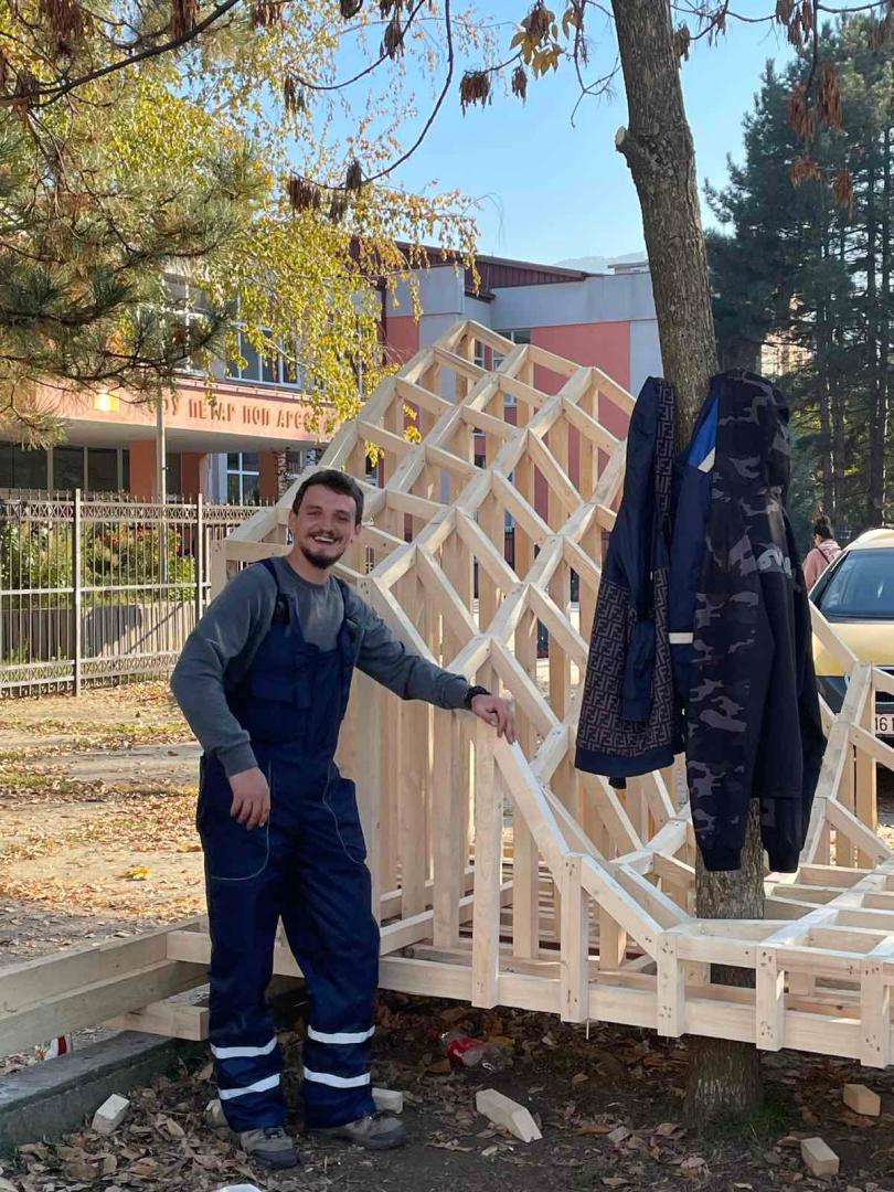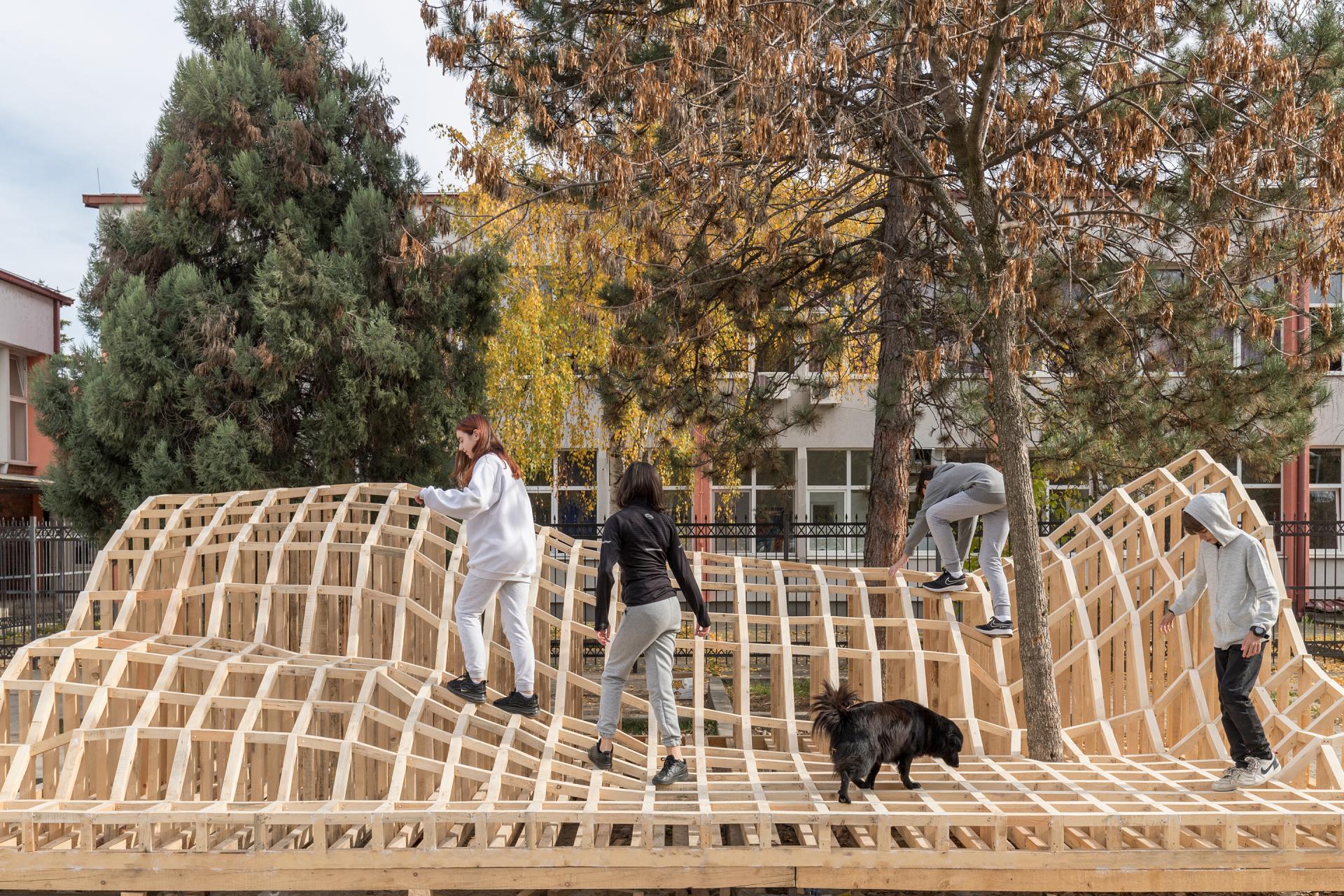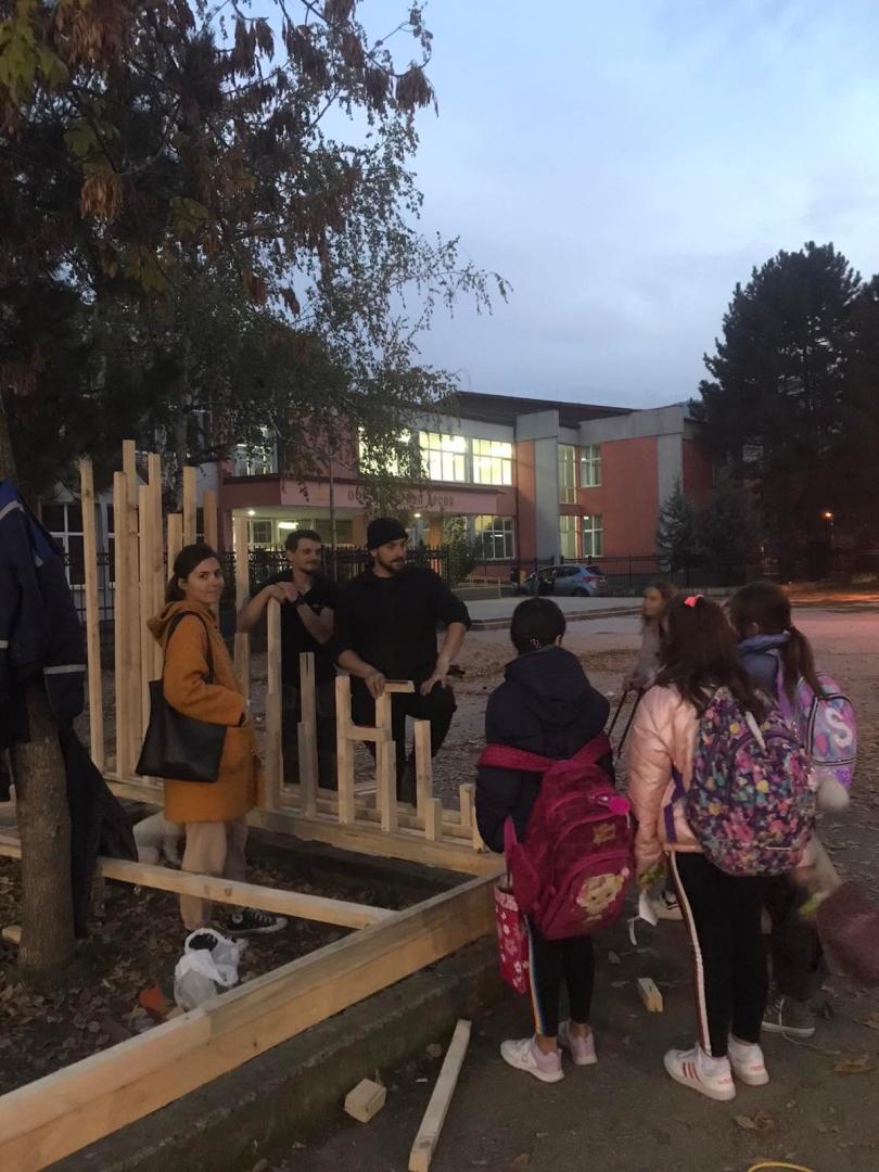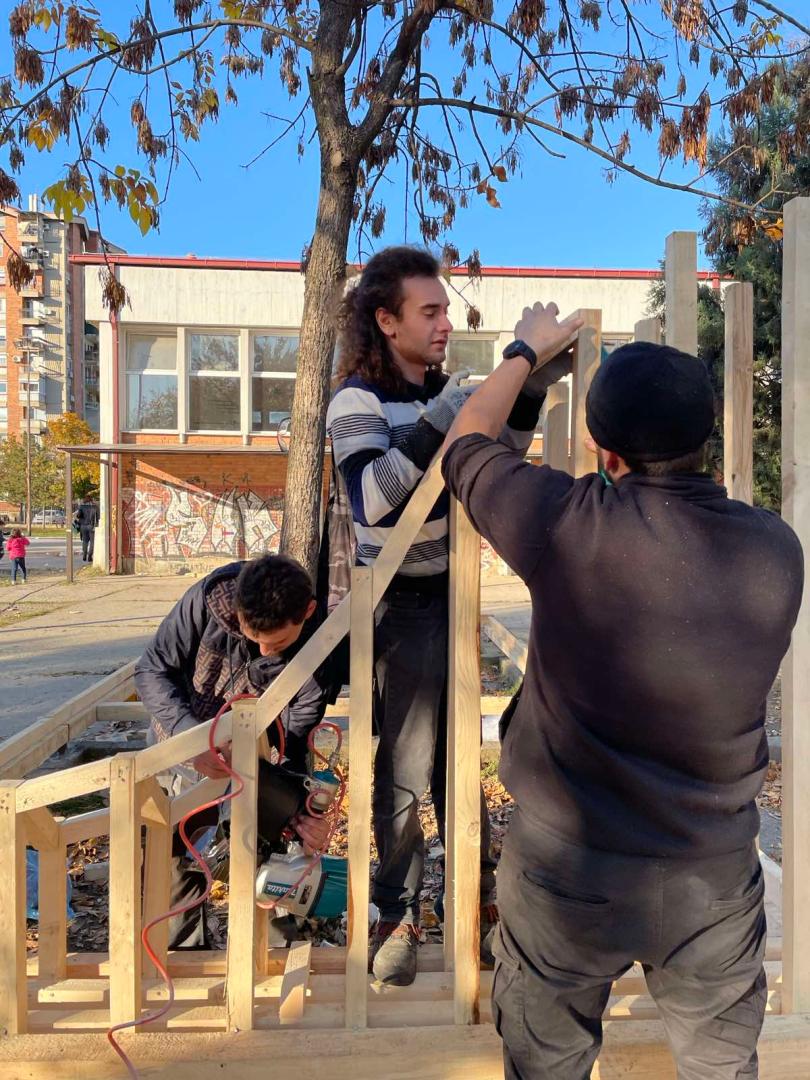 The realization of the project was in Skopje where local young carpenters and students participated in the construction of the public intervention and implementation of the design. It is inevitable to mention the children from the school that were very excited and helped the process in their own way, by giving fresh ideas and sharing snacks with the carpenters during the 3-week construction, and thus appropriated the new look of the public space.