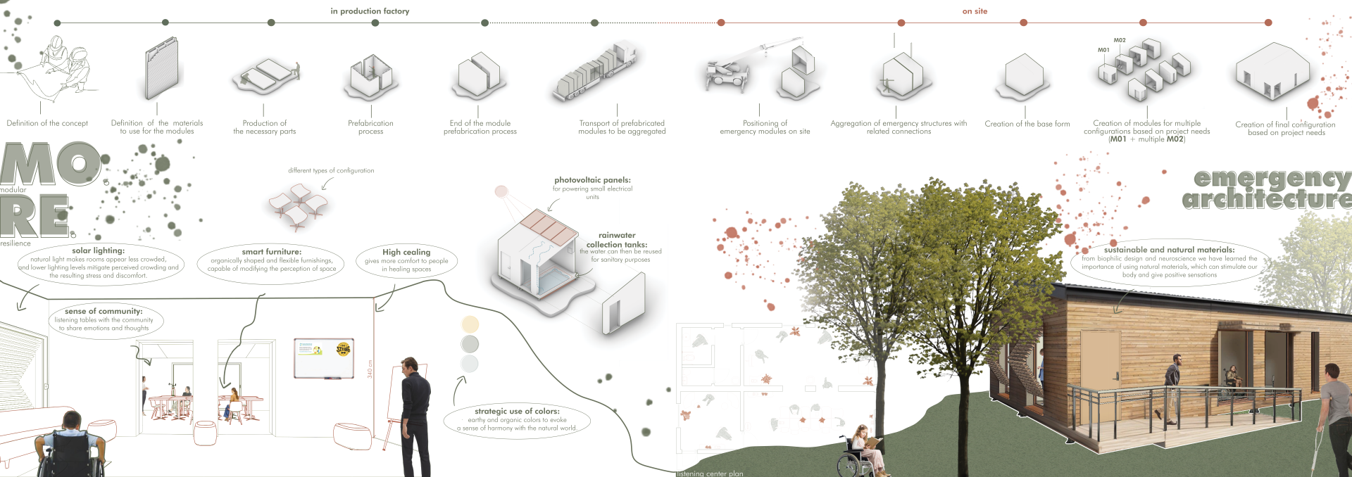 The work has as its theme the analysis and development of resilient, flexible and high-performance temporary healthcare structures for emergencies, built with sustainable materials and specifically designed to be "spaces for people", in which everyone can find help and feel less oppressed.