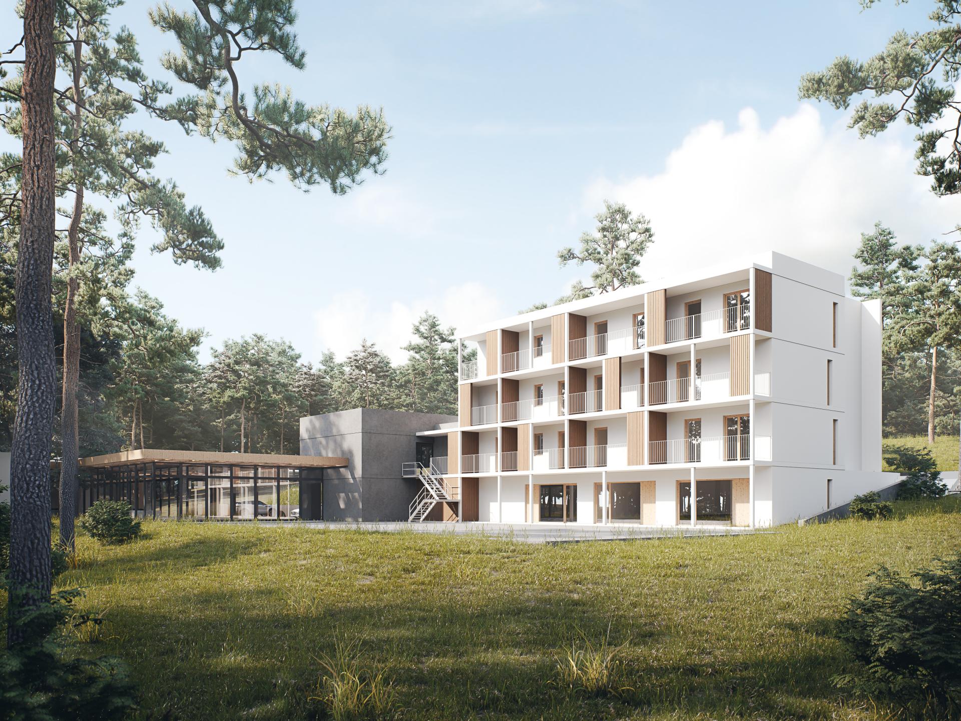 The architecture of the resort complex refers to the traditional buildings of Warmia and Mazury, with a modern twist. The Hotel building has remained in an unchanged form, consistent with the existing tissue, the renovation of the facade has been carried out. The materials used for the construction intention come from local sources, and the investment itself brings together local entrepreneurs, providing them with the opportunity to develop and continue working in the region.