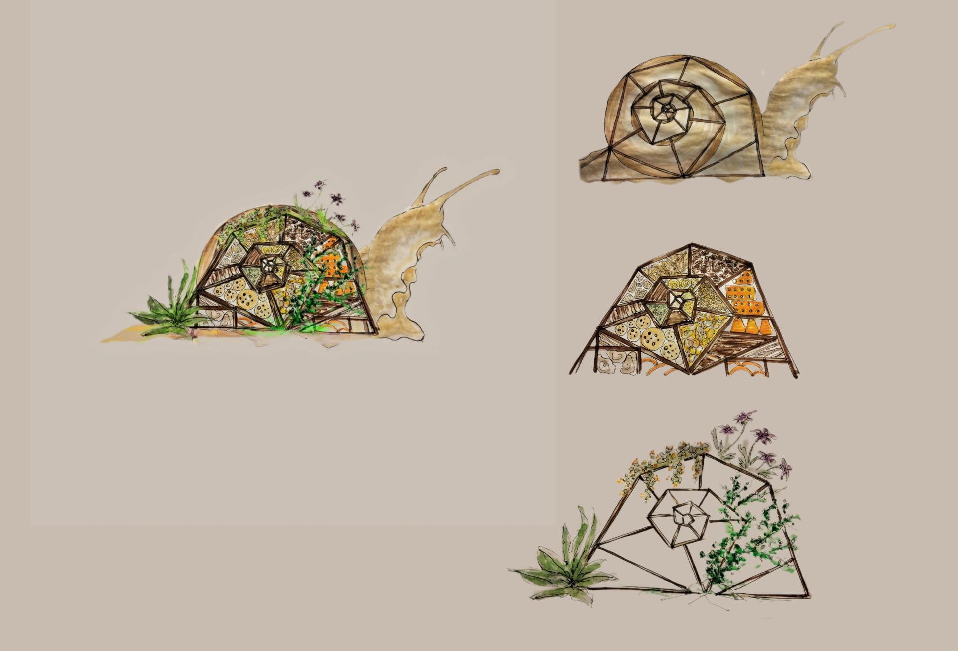 The accommodation inside the sculptures will mainly made by reusing and recycling waste materials from local businesses, such as pallets, beams, pallet trucks, boxes. The compartments of the "Bug Hotels" will be filled with natural and artificial materials collected following a cleaning of the intervention site.