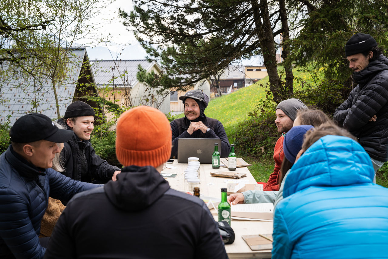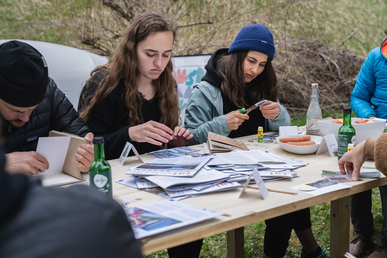 took place over 10 months from January to October 2022. The first design intervention was taking place in April 2022 on three days over the weekend. Members of the alpine community, and members from the outside were participating in the NDC and its design workshop at the living laboratory space Tal/Studio in St. Gerold, one of the six municipalities forming the biosphere reserve region. The design project included the Nature Design Camp, “Nature > Human” design workshop, and “Nature Design Guide” (NDG) print publication was funded by the KLAR! programme of the federal climate and energy fonds with the initial brief of facilitating a climate change think tank. Therefore, REGIO set the framework of the project to respond to the original think tank brief. The entire project was co-designed with the REGIO CEO, who was involved in all the decisionmaking along the process. Valuable feedback and ideas were discussed from the start until the end to have a critical stance via a constant exchange between an outsider and insider role in the biosphere reserve region.