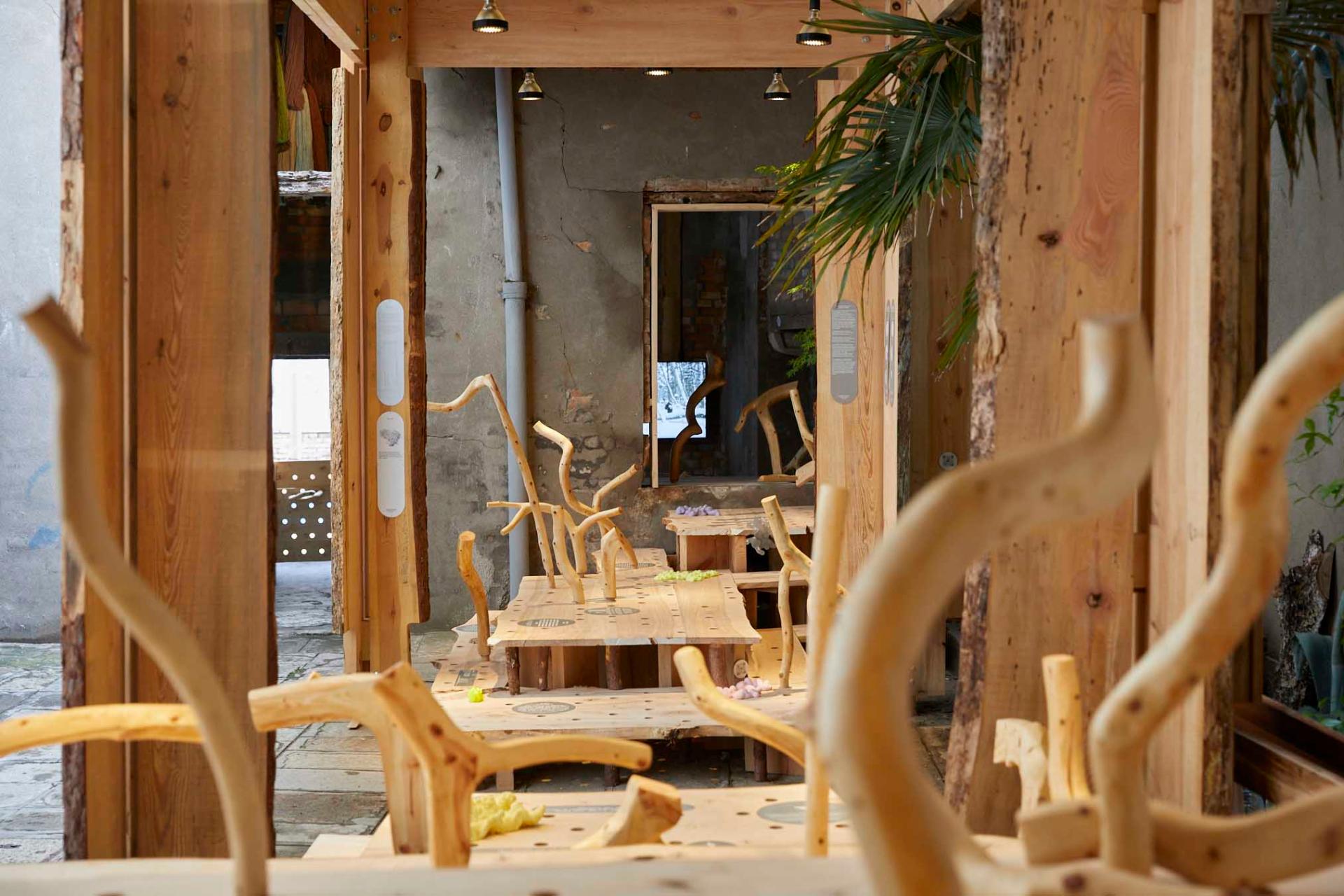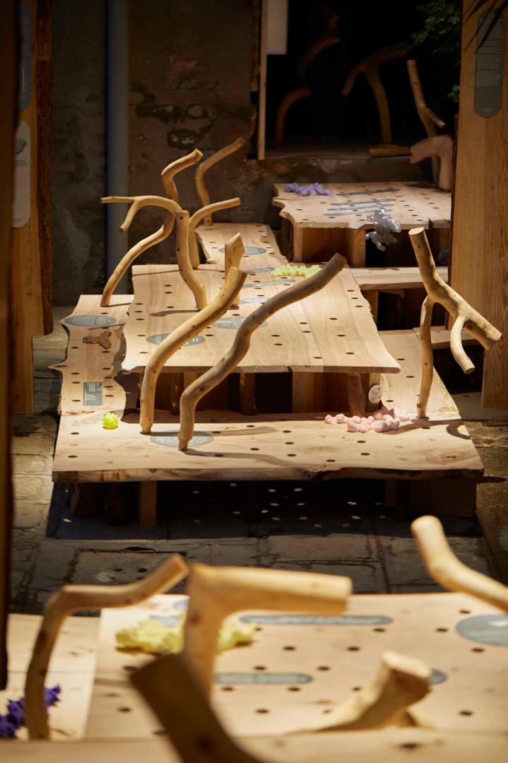 Timber Repurposing: Timber, initially designated for biofuel, not suitable for industrial use due to its intricate geometries, is made available for design practices to showcase possible aesthetics of sustainability.