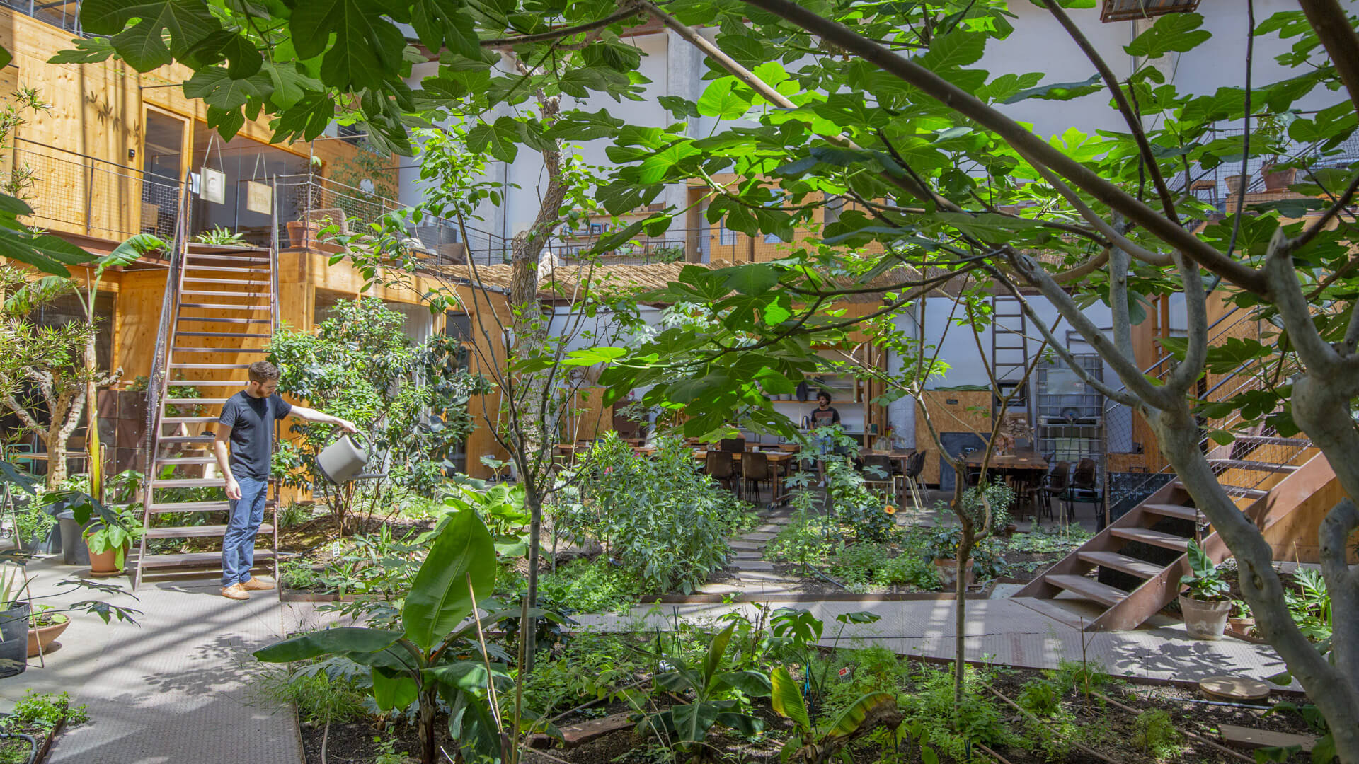 The Nest City Lab is an urban lab dedicated to regenerative practices. The space in the heart of the @22 innovative district of Barcelona offers a live version of the sustainability goals of the city. 1800 m2 of renovated old industrial building with an indoor edible forest at its core, shared spaces for sustainable activities as an urban aeroponic farm, a post-industrial kitchen with plant based organic and km 0 focus and a well being studio based on the reconnection with natural cycles.