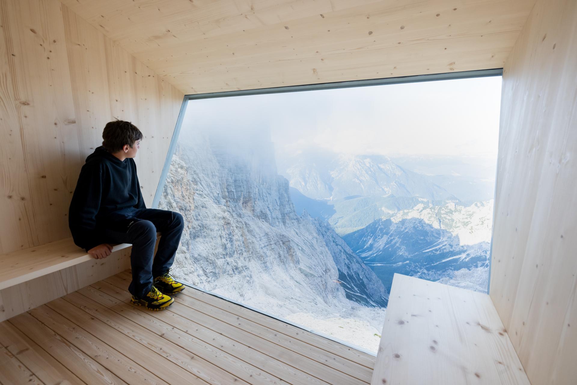 The problem of the accumulation of snow is solved by raising the entire structure above ground level: In order to offer less grip to snow, the bivouac floats in the air, just supported by three, almost invisible posts embedded in the rock. This solution not only makes the bivouac easily accessible even in the presence of 2 metres of snow, but also generates a viewpoint that is higher than the common walking level, giving the visitor the sensation of being suspended on the mountain ridge.