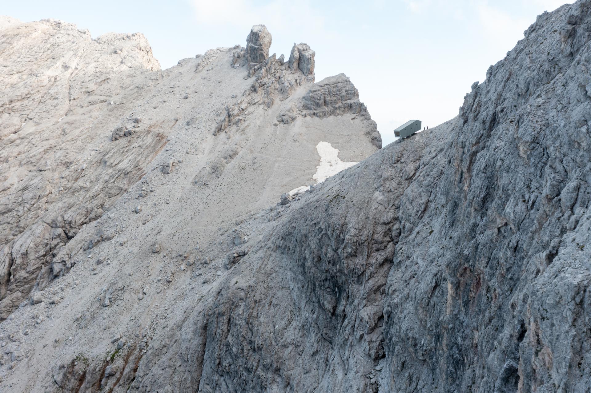 Its fibreglass body bends along the cliff profile and draws a visual tracer, an attempt to amplify and frame the landscape, a space coagulated around the tension between the vastness of the natural architecture of the Alps and the minute one of the bivouac