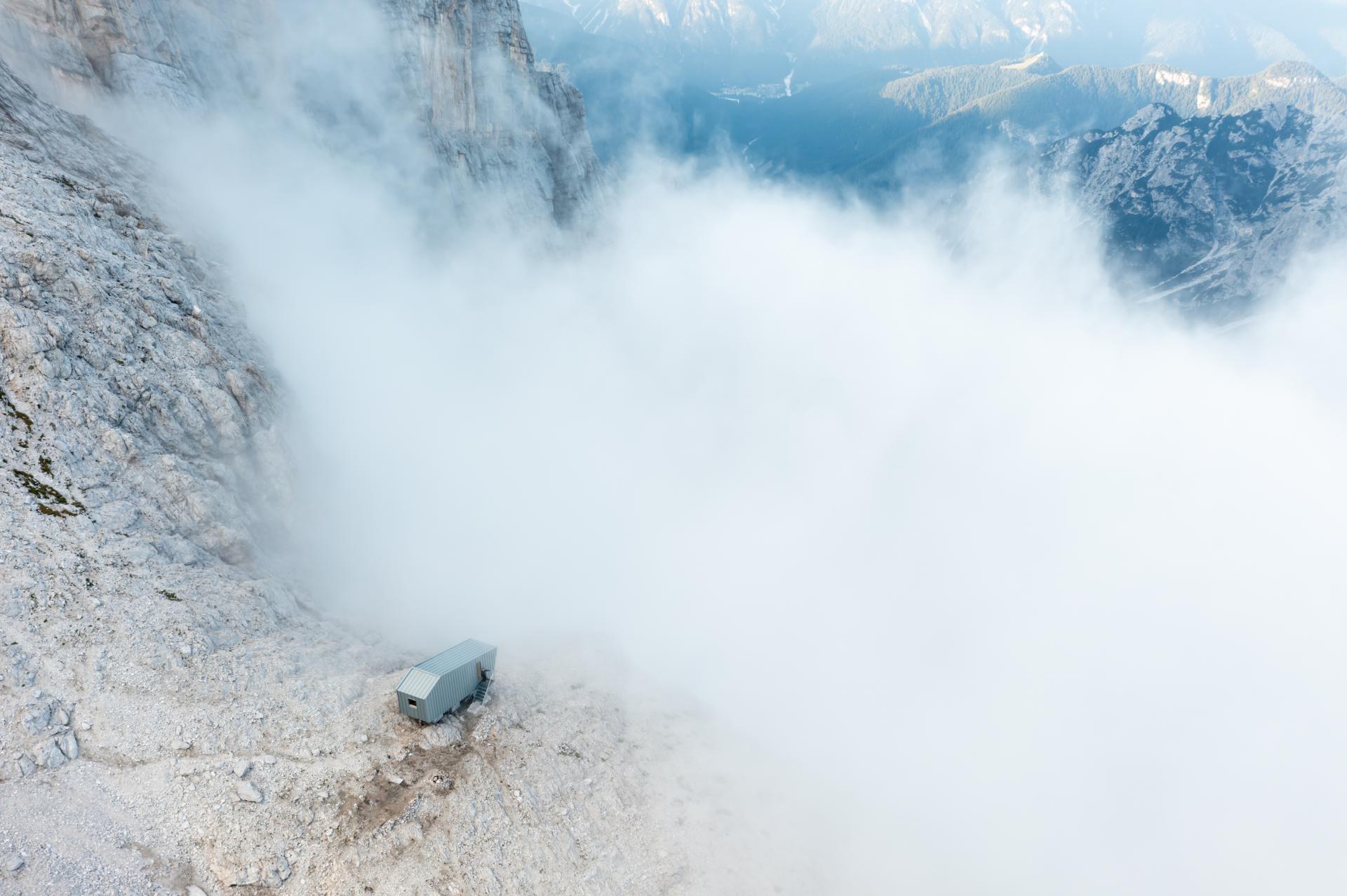 The new Fanton Bivouac is a protective shell at high altitude, a rough-hewn sloped volume that inhabits the Marmarole saddle in the Dolomites, a boundless space at 2667 m.a.s.l, a context made of rock, light, wind, snow and distances.