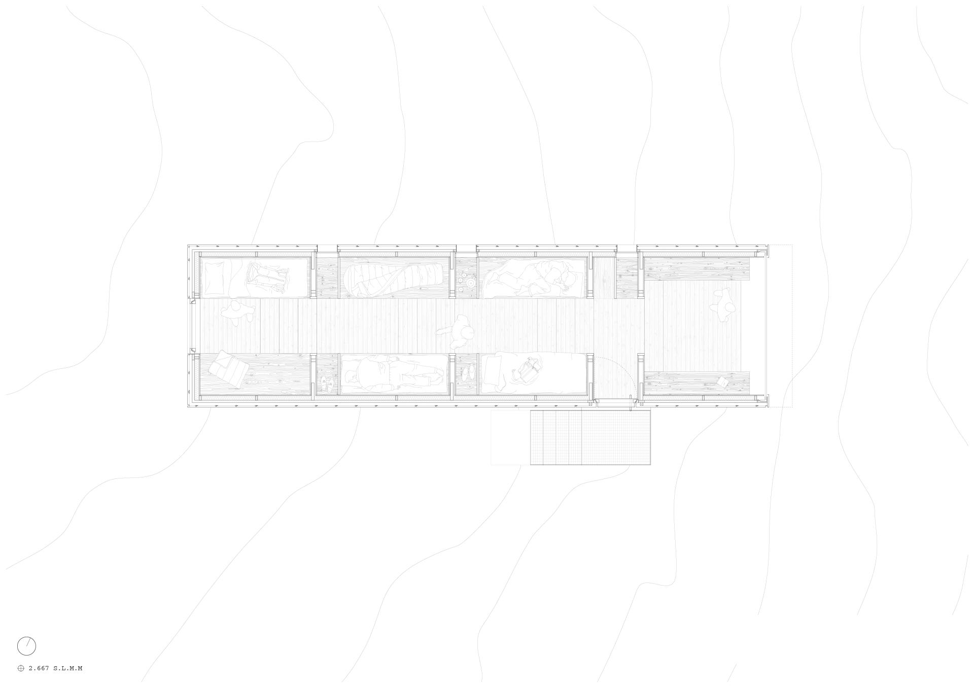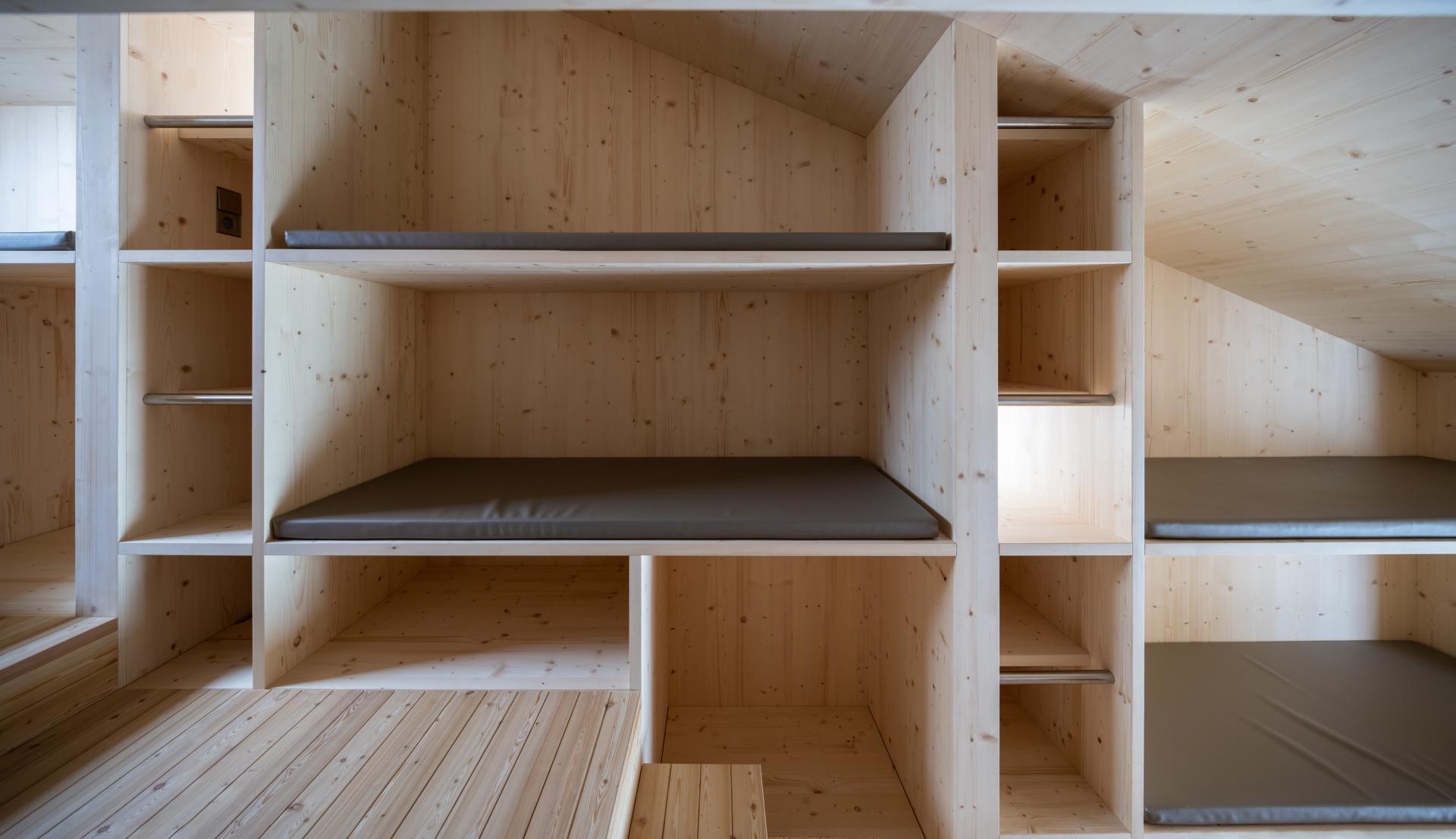 The development of the project along the slope is used to rethink the coexistence of the guests within it: the different levels of the environment create an immediate spatial hierarchy according to their different degrees of privacy. The lower, more open level directly overlooks the valley and is connoted as an environment for meeting and discussion. The communal space continues longitudinally in the opposite direction, heading towards the peaks behind, through different levels leading to the most intimate areas, the niches serving as resting areas.