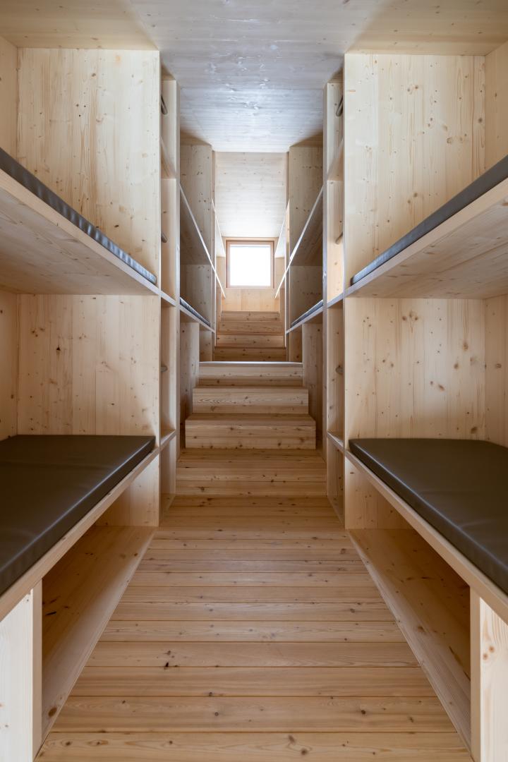 The enclosed dimension of the bivouac constitutes its inclined habitat, parallel to the ground below pointing downstream. It is an inhabitable telescope that frames the context of the Municipality of Auronzo di Cadore and enhances the landscape. The Bivacco Fanton is crossed by a staircase, which creates the spatial section suitable for the movement of the gaze that echoes the movement on the impervious dimension of the context in which it is located. The staircase describes a central void and ends in a meeting point: a room reaching out into the void, set up by convivial functions, defined by linear seats that face each other. Within this boundary closed by a sloping glass surface exposed on the cliff, it is possible to redefine the relationship of one’s body with the scale of the surrounding mountains.