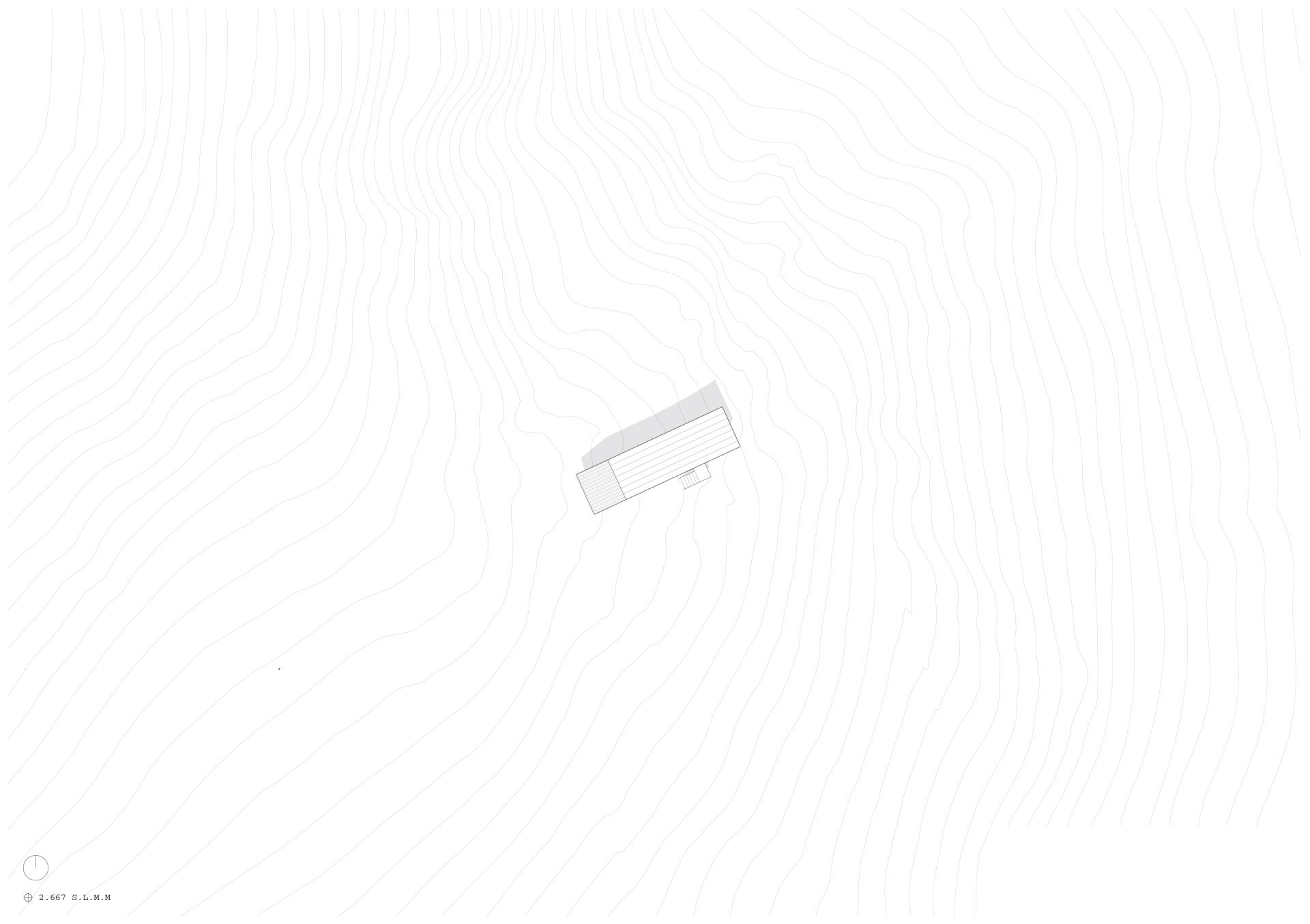 A volume defined by nature, an architecture characterized by a strongly inclined profile that adapts itself to the orography of the Marmarole. A section that maintains its strong value in the internal space, becoming its generating element, organizing the internal space upwards following it along the longitudinal axis, generating an axis that connects the site and the Auronzo valley.