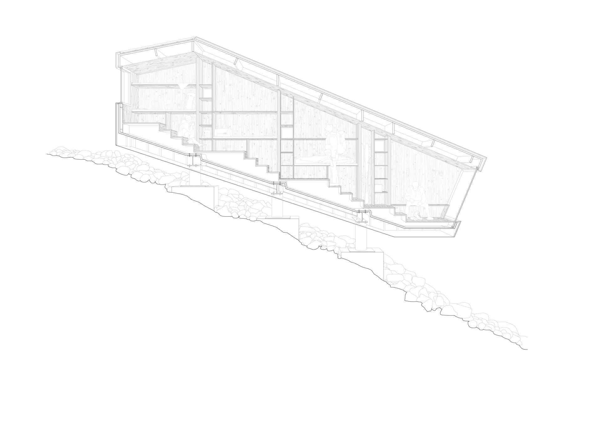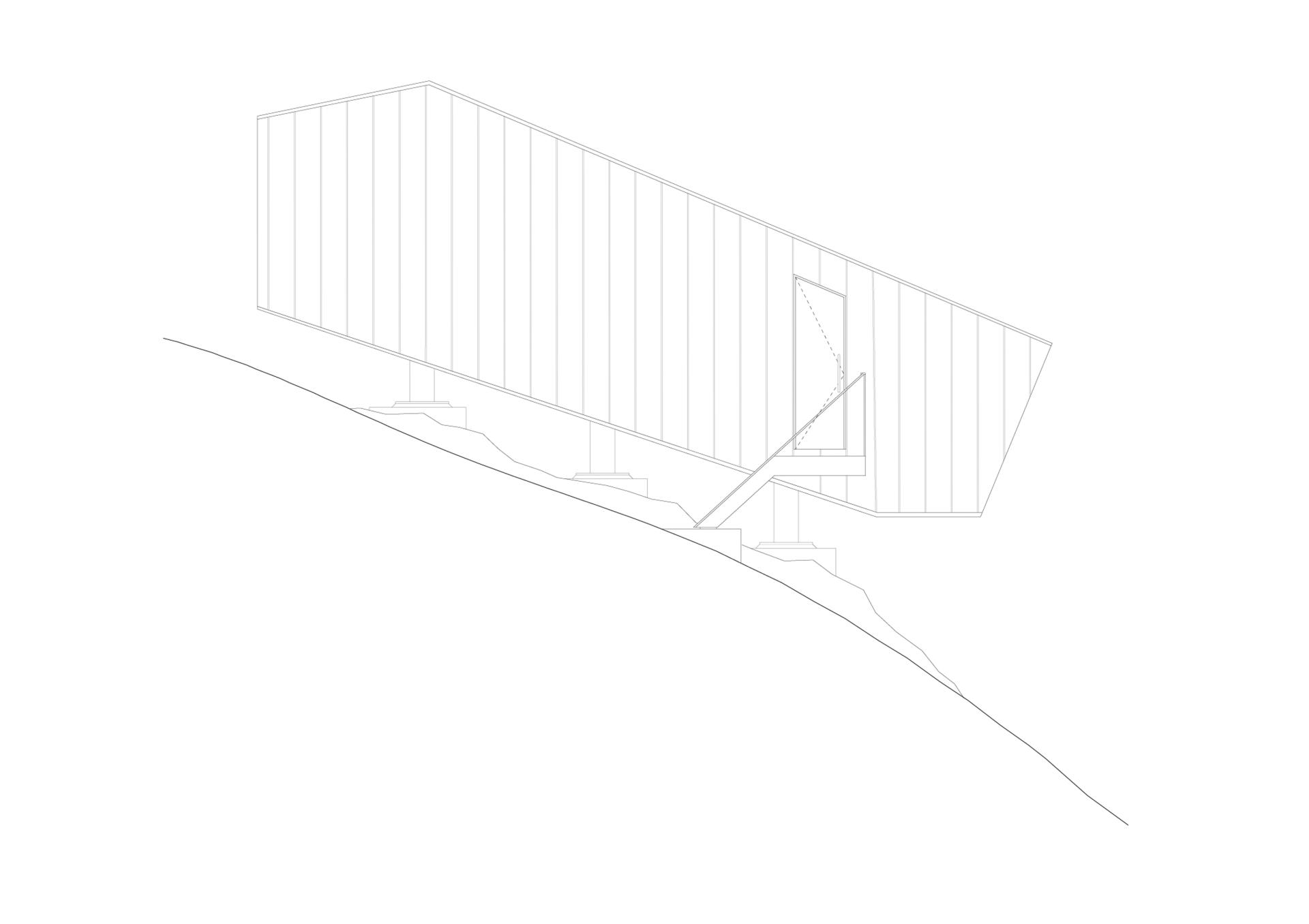 It is an unstable equilibrium, which is substantiated in the internal space of the project: a wooden belly that softens the impact of wild nature, then the glass fibre which thickens layer by layer, like a second skin that becomes shell and structure together. Externally, its formal appearance takes on the features of a rough-hewn volume suspended on a bristling cliff, a waiting body stretched out into the void, intent on opening a spatial dimension beyond its own internal geometry.
