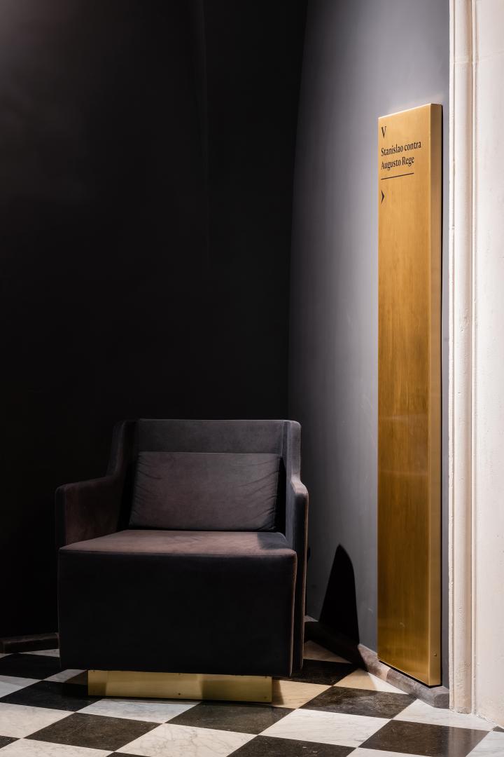 The play of light and shadows is not only the crucial visual element of the project, but it is also its main design idea. Objects emerge from the dark. The arrangement discreetly emphasizes the historic interiors and draws attention to the most important objects. Simple, minimalistic forms of display elements are made of precious materials and constitute a background for the most important "heroes" of the exhibition. All in an elegant way that harmonizes with historic interiors. Gold shimmers and appears in the details of the arrangement – in the carriers of visual information and typography or details of the showcases.