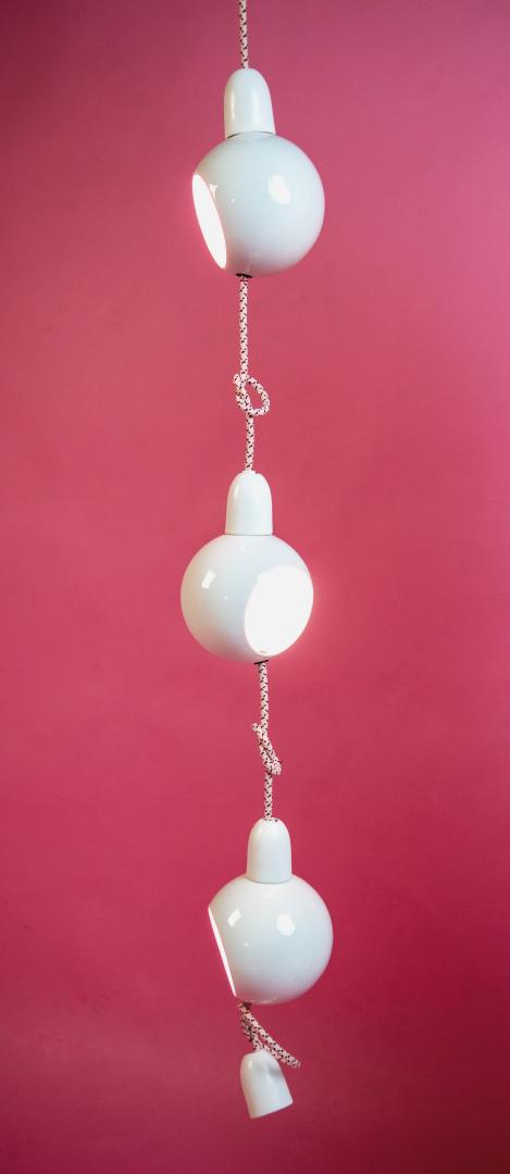 The round shape and bright colours are inspired by Estoplast, a company that has a nostalgic effect on almost every Estonian, as they produced the most commonly used household plastic and electric devices in the Soviet Union. Egg lamp’ s technical solution enables the combination of several lamps to create light chains of various lengths for different scenarios. This allows the user to complement their lamp at their own pace. By making knots in the cable or experimenting with colours, everyone can create their own lamp with desired characteristics.