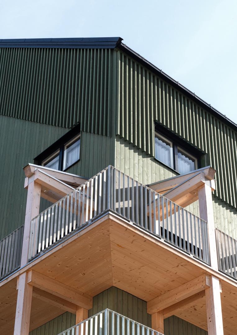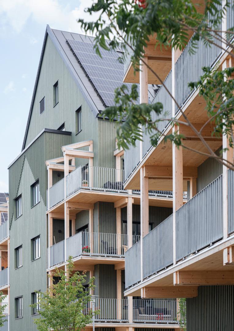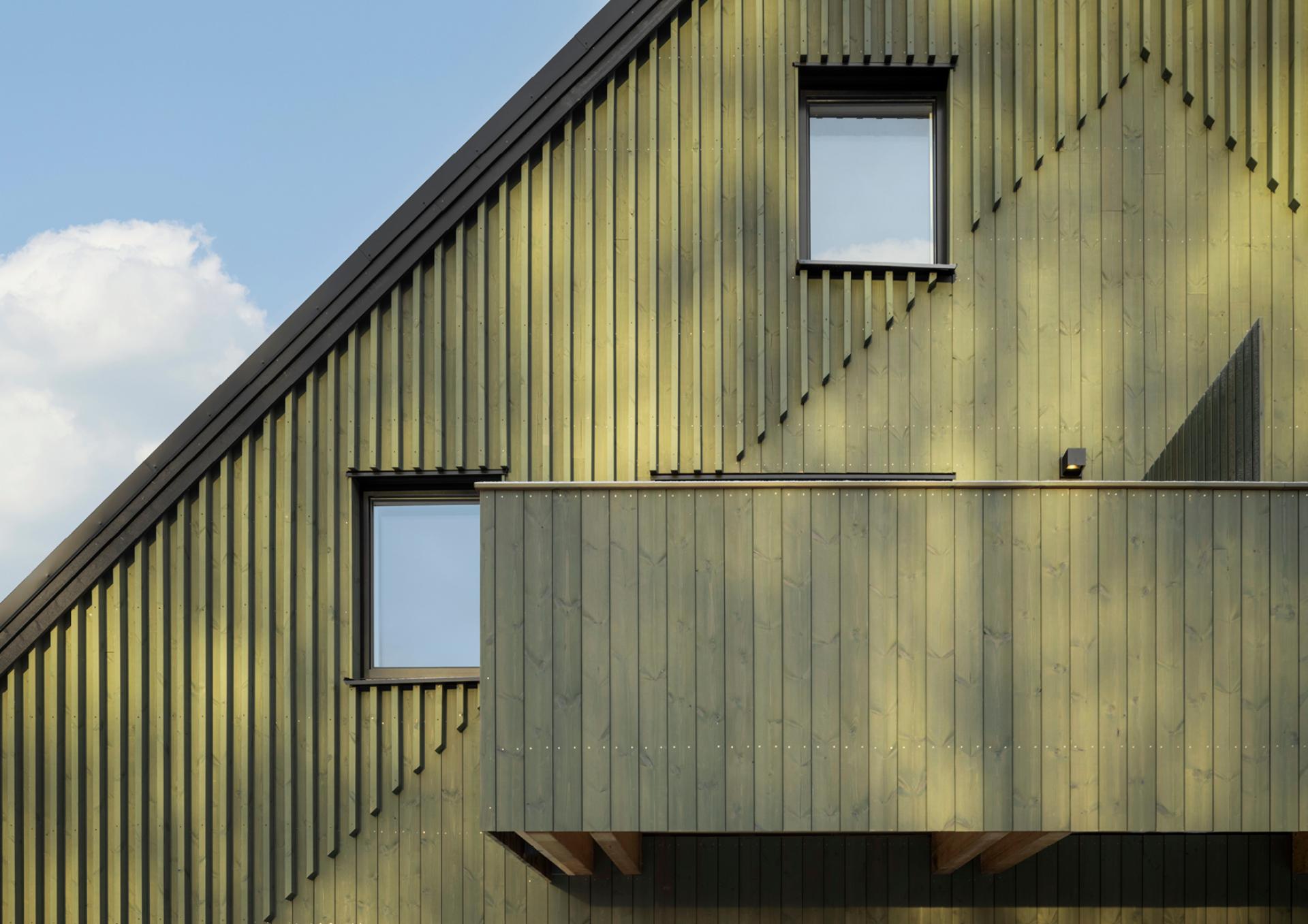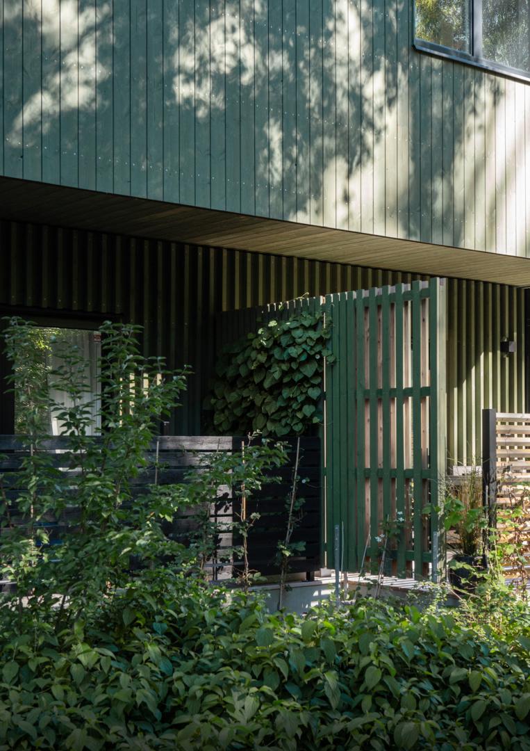 The facades have green heat-treated wood panels with decorative elements. Wood is a recurring theme and both houses are built using modern timber construction techniques. The exterior construction creates a loggia at the front of each apartment. A simple touch that adds a sense of willowy quality.