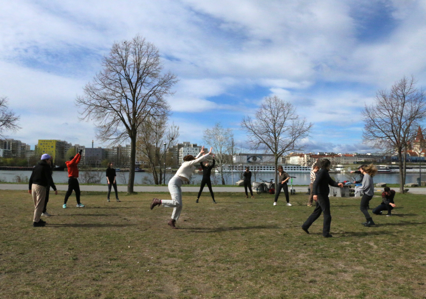 Working with students in different informal expeditions and group actions, we are experimenting with cross-discipline presentations for example: acting as misleading tourist guides, desired landscape painters, aspirant speculative biologists, unlicensed journalists and incompetent fitness trainers. In each of these acts, the Danube is our classroom. As tourists guides we are changing perspectives and inspire a nuanced understanding of the river from the perspective of other animals and plants. As landscape artists we reproduce the colours of the Danube, which varies according to troubled histories, sluggish economies, changing geographies. As speculative biologists we are focusing on the realm of speculative evolution - how animals in/around the river might evolve in the future due to climate change. As journalists we are delivering news from the future directly from the river. As fitness trainers we are delivering a series of body-exercises, for example mimicking clams' movement and burrowing behaviour, because understanding how clams' move across space and time can be a fundamental question in Danube’s ecology [performance titled: 'Fitness for Unlikely Species'].