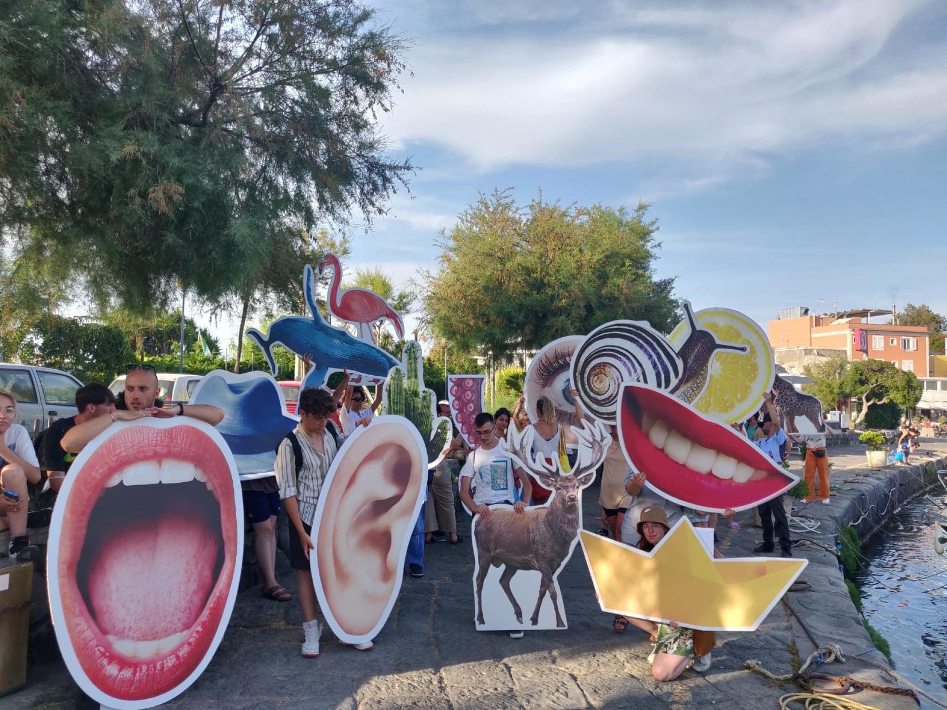 During the “opera event” in June 2022, the final and cathartic moment of the entire relational artistic process, an invitation to travel was created, a dreamlike journey that allowed the inhabitants of the island to start dreaming again on that same territory crossed daily, through digital and analogic aesthetic devices including the scenarios (https://www.youtube.com/watch?v=yGy0OxmcJL4; https://www.youtube.com/watch?v=URKCnT2WC1Y; https://www.youtube.com/watch?v=8VEEyGiZLng). The scenarios were set up on the streets and in the shops of Procida: penguins, ostriches, mouths, cacti, etc., alienating elements, extraneous to the real context of the island, making aesthetic contrast with the Procida territory (https://www.youtube.com/watch?v=rHGxNrx4w5U).