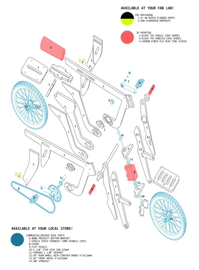 The bicycle designs resulting from this initiative must be able to be manufactured by users using the resources of a local digital fabrication workshop (fablab) such as 3D printing and CNC cutting and reused bicycle parts.