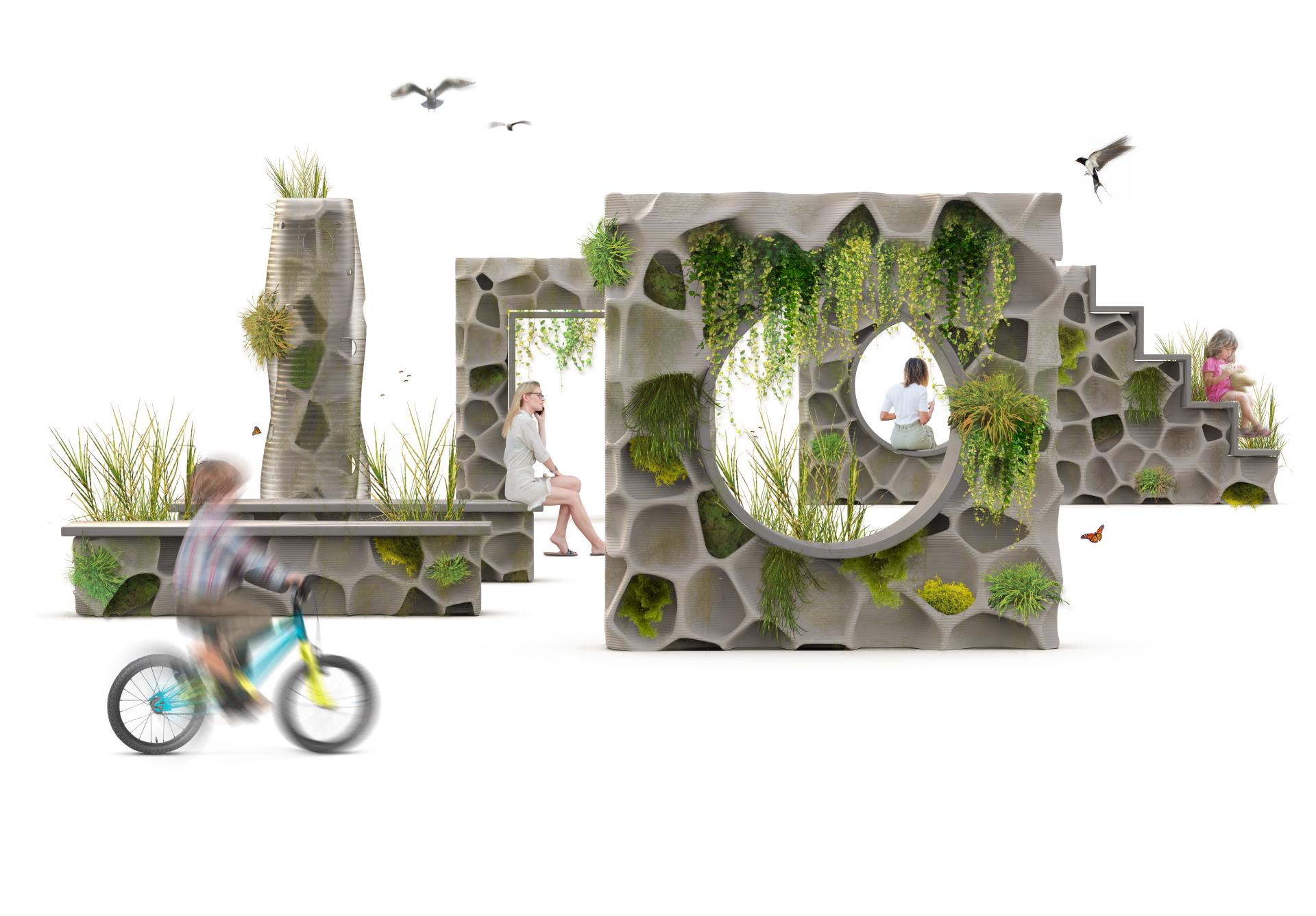 As regards the product created (a series of bioreceptive structures) the innovation lies in the bioreceptivity of the shapes, in fact without human intervention and without particular maintenance these structures will welcome vegetation which will contribute to bringing biodiversity back to the city and consequently to improve air quality thanks to the photosynthesis process.