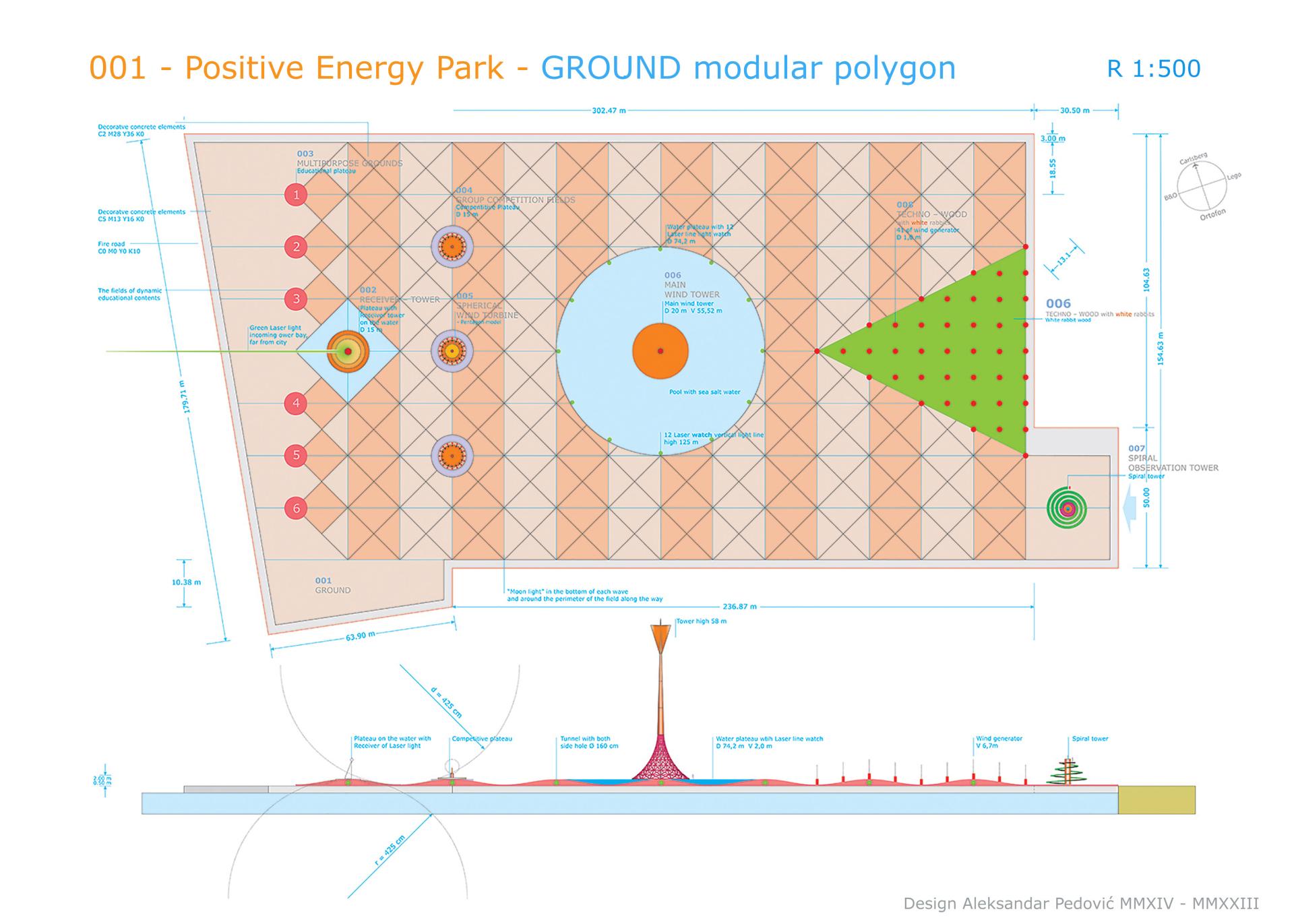 Positive Energy Park is an original concept of a modular polygon with variable size and shape, applicable anywhere in the world, in various locations with the implantation of modules for the production of green electricity from a large base of modules, according to the geographical position and climate profile. The greatest ontological value is the inclusion of all generations of the local community through educational - recreational - scientific programs, which makes it unique in the world.