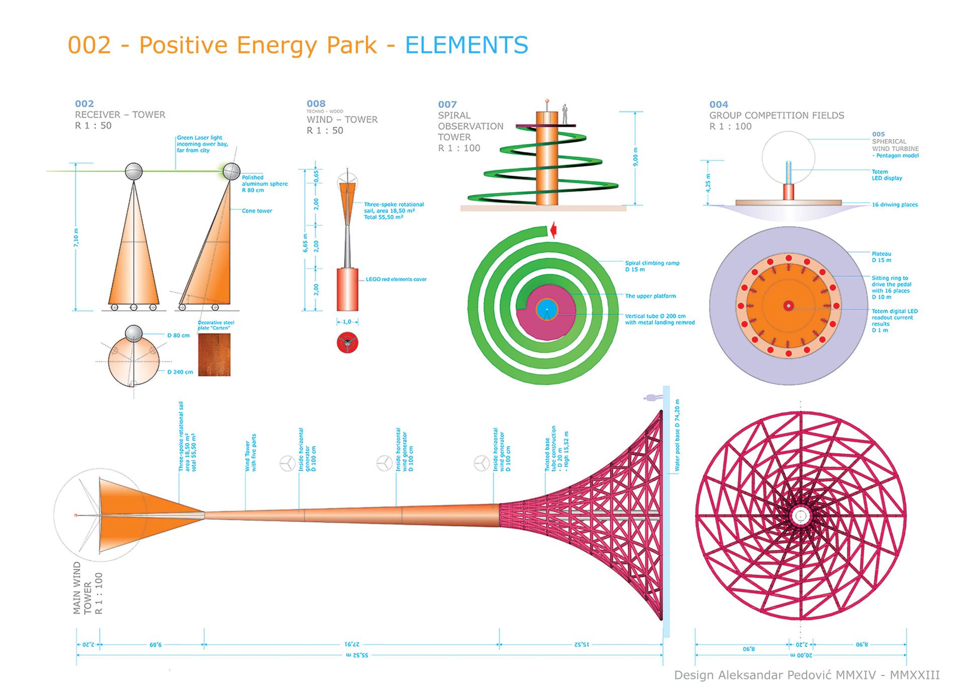 Positive Energy Park is designed as a variable modular complex of elements from the base, which are applied to an optimized polygon according to the available space of any size, anywhere in the world - wherever it is necessary and possible. It is especially interesting for environments where there is no regular electricity, and in my opinion, the most important quality of the unique concept is that all generations of the local community are involved in various programs, which they profile at the end of the current year for the next. There are educational-experimental elements, sports, recreation, etc...