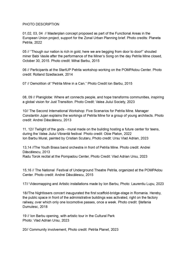 Our methodology can be likened to an x-ray, revealing the expectations of the local population and the projections of specialists concerning Petrila Mine’s functional reconfiguration. In doing so, it delineates an entirely new local identity. Originating from individual artistic expressions and a collective sense of disappointment in response to the mine's closure, this bottom-up process has became a final product that will align the local industrial heritage to the EU ambition of transitioning to a green, inclusive and carbon-free economy.